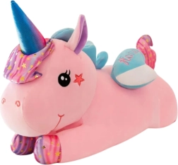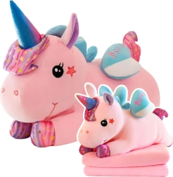 A 3 az 1-ben plüss unikornis praktikus és elbűvölő társ a gyerekeknek. Szolgál ölelgetnivaló játékként, kényelmes párnaként, és egyben nagy, 160 × 110 cm-es takarót rejt mesenézéshez, kanapén való pihenéshez vagy autóba. Az 55 cm-es méret pont jól simul a karokba, és melegséget, biztonságérzetet ad.