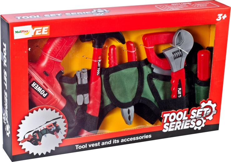 Praktikus gyerek szerszámos öv kis mestereknek 3 éves kortól. A készlet tartalmaz fúrót/csavarozót, kalapácsot, csavarhúzót és francia kulcsot, hogy a gyerekek biztonságosan kipróbálhassák az alap barkácskészségeket. Ideális a finommotorika, a kreativitás és a szerepjáték fejlesztéséhez.
