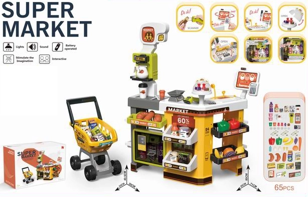 A szett tartalmaz tágas pultot, bevásárlókocsit, értékesítési kiegészítőket és dekoratív élelmiszereket. Az elektronikus hűtő, a fizetési terminál és a kézi, elemes szkenner interaktív játékot támogat, és fejleszti a fantáziát.