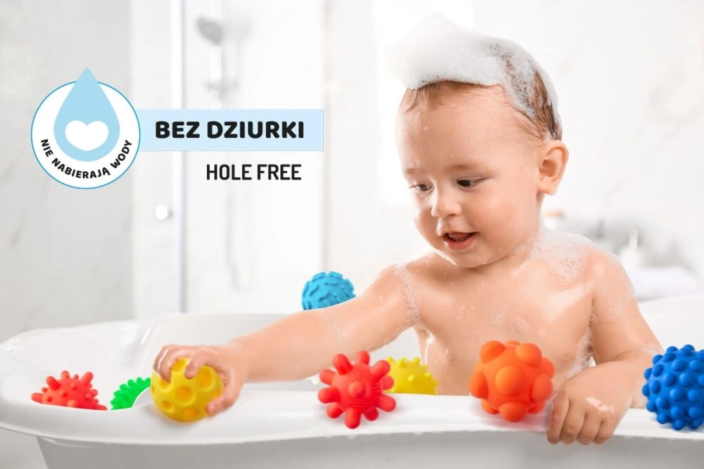 Minden labda eltérő struktúrájú, átmérőjük kb. 59–77 mm között változik, így a gyermek fokozatosan tanulhat különböző méretű tárgyakat megfogni. A nyílásmentes kialakítás megakadályozza a víz és a szennyeződések bent maradását, ezért a labdák fürdéshez is ideálisak. Megfelelnek az európai szabványoknak, és biztonságos, érzékszervileg gazdag szórakozást nyújtanak otthon és útközben is.