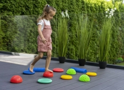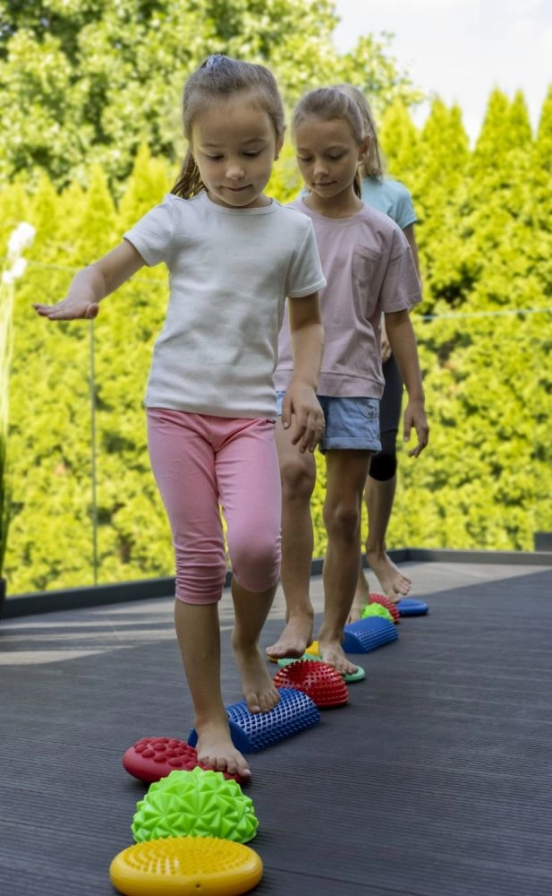 A 11 színes elemből álló szenzoros ösvény félgömböket, korongokat és félhengereket kombinál különböző textúrákkal a változatos edzésért. A gyerekek „kőről kőre” lépdelve fejlesztik a boka stabilitását, a teljes testtartást és a nagymozgásokat, a felnőttek pedig aktív egyensúlygyakorlatokra és talpmasszázsra is használhatják.