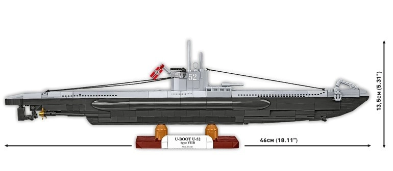 Az U-BOAT U-52 VIIB típus 1:144 méretarányban egy precízen kidolgozott építőkészlet, amely hűen adja vissza az egyik leghíresebb német tengeralattjáró formáit és részleteit. A kb. 46 cm hosszú modell valósághű elemekkel tűnik ki, mint a periszkópok, az árboc kötelekkel, a propellerek és a fedélzeti részletek. Összeépítés után impozáns dekorációvá válik a mellékelt talapzaton a modell nevével és méretarányával.