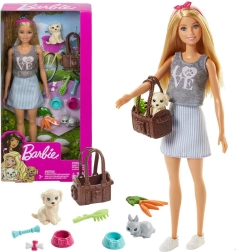 Ez a bájos készlet mindent tartalmaz, amire a gyerekeknek szükségük van a kisállatgondozásról szóló történetekhez. A BARBIE realisztikus részletekkel, mozgatható végtagokkal és modern szettel érkezik, fehér tornacipővel és rózsaszín hajpánttal kiegészítve. A csomagban kutyus és nyuszi figurák, valamint gazdag kiegészítők vannak az etetéshez és a gondozáshoz.