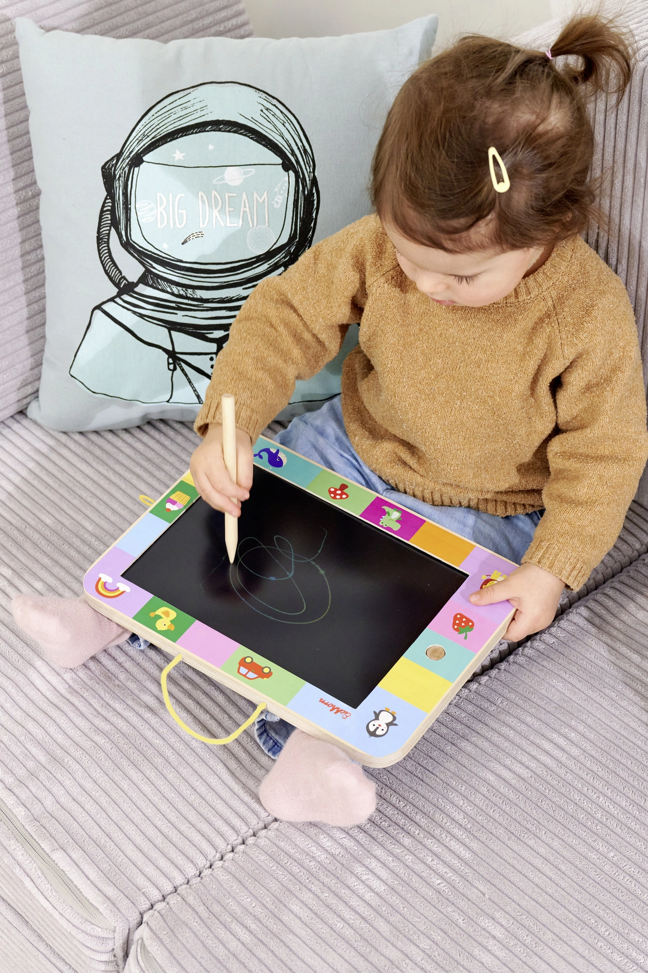 Kompakt méreteinek és fogantyújának köszönhetően a tábla könnyen hordozható. Ideális a kanapéra, autóba és utazáshoz – rajzolás bárhol, bármikor.