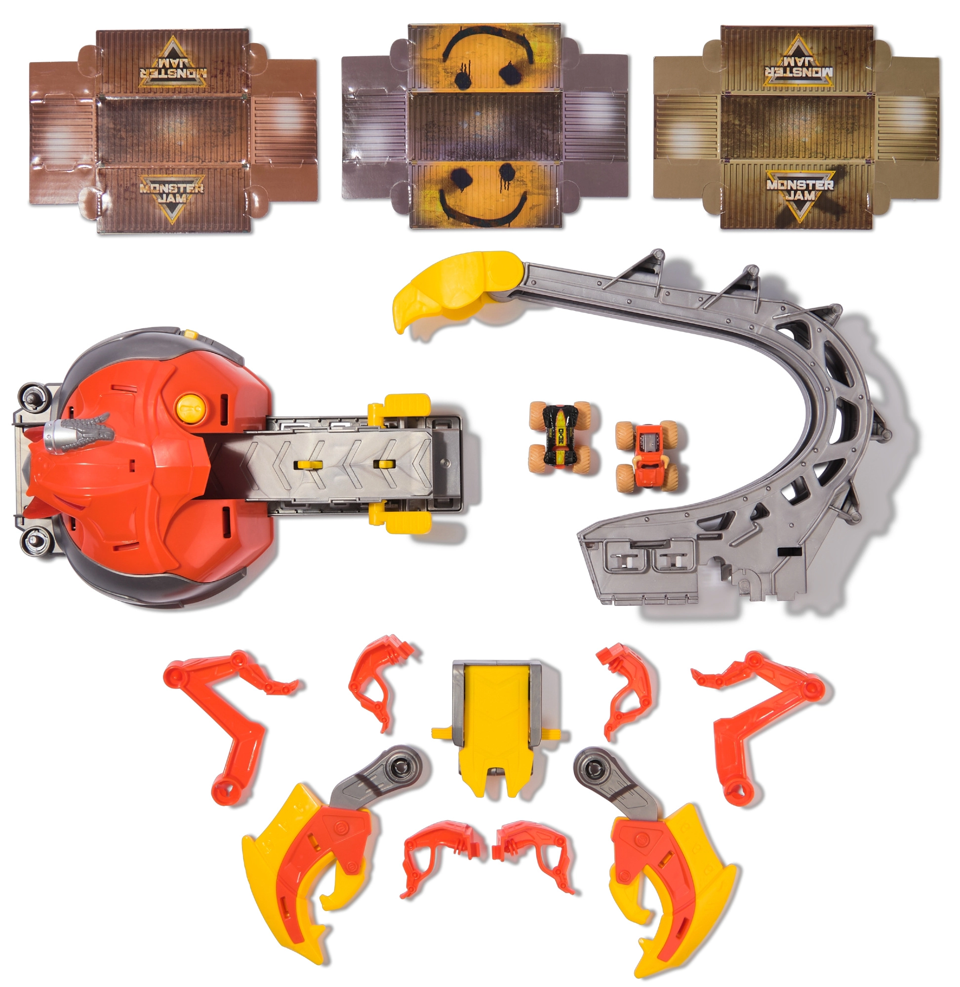 Az átgondolt és biztonságos konstrukció megóv a nem kívánt kilövésektől – meg emeléskor a hajtás automatikusan leáll. Játék után a teljes szett akár 12 mini truck tárolódobozává alakul, így minden készen áll a következő akcióra. A csomag része két fém mini modell, EL TORO LOCO és MAX-D autentikus részletekkel.