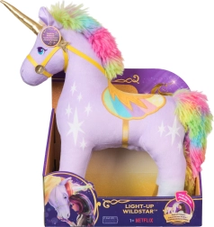 A WILDSTAR plüss egyszarvút a népszerű UNICORN ACADEMY sorozat ihlette. Puha lila plüssből készült, világos „varázslatos” motívumokkal, csillogó arany szarvval és patákkal, szivárványos sörénnyel és farokkal, valamint elegáns hámmal. A homlok érintésére a szarv és a dekoratív elemek meleg LED fénnyel felvillannak, és varázslatos hang hallatszik.