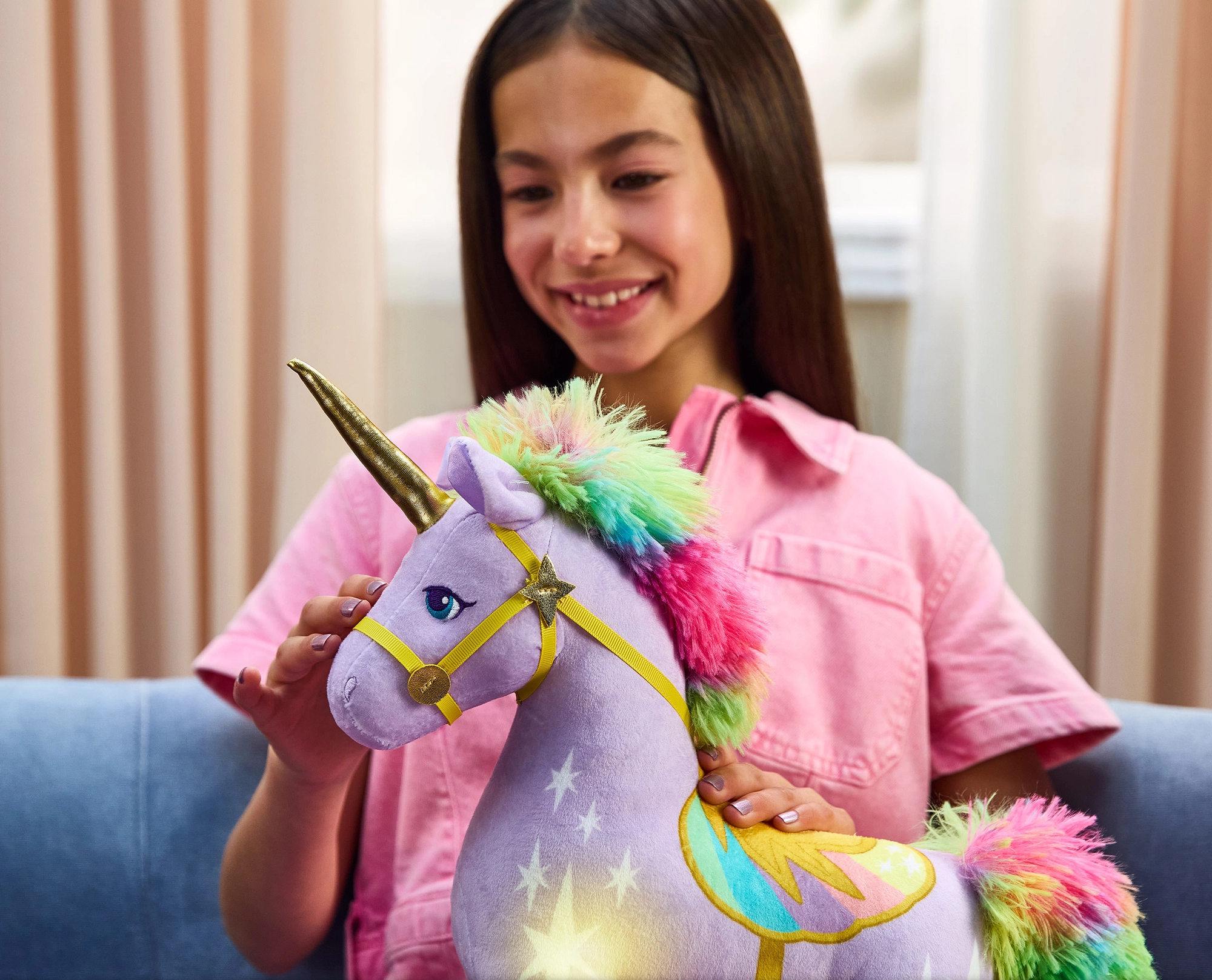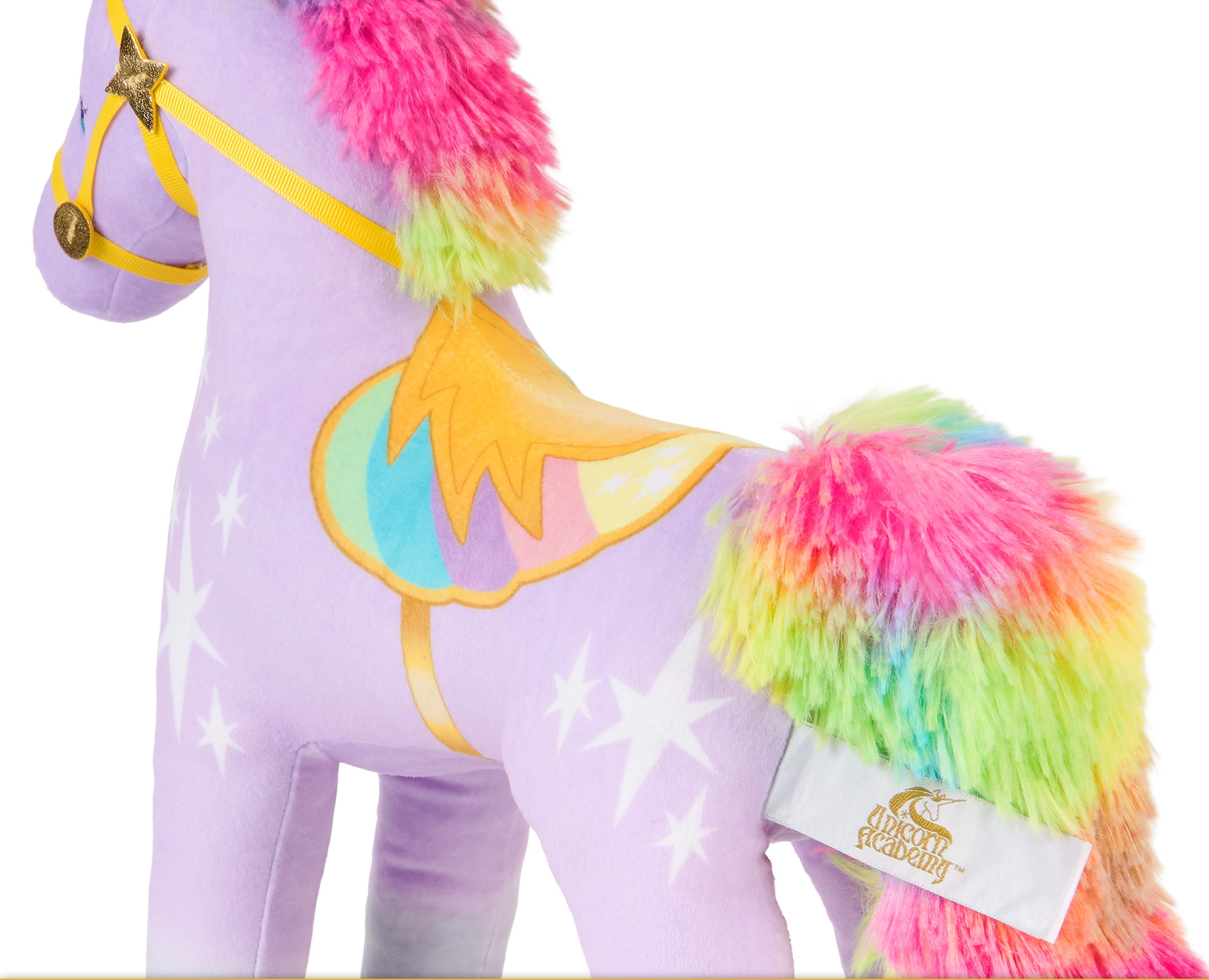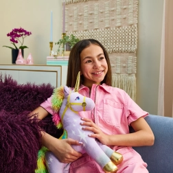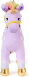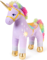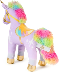 A pihe-puha lila anyag, a szivárványos sörény és farok, valamint az arany akcentusok prémium megjelenést és kellemes tapintást biztosítanak ölelgetés közben.