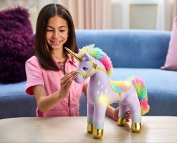 A szarv és a díszítő motívumok a testen meleg LED fénnyel világítanak fel érintésre, és finom hang kíséri – ideális esti mesékhez és varázslatos játékokhoz.