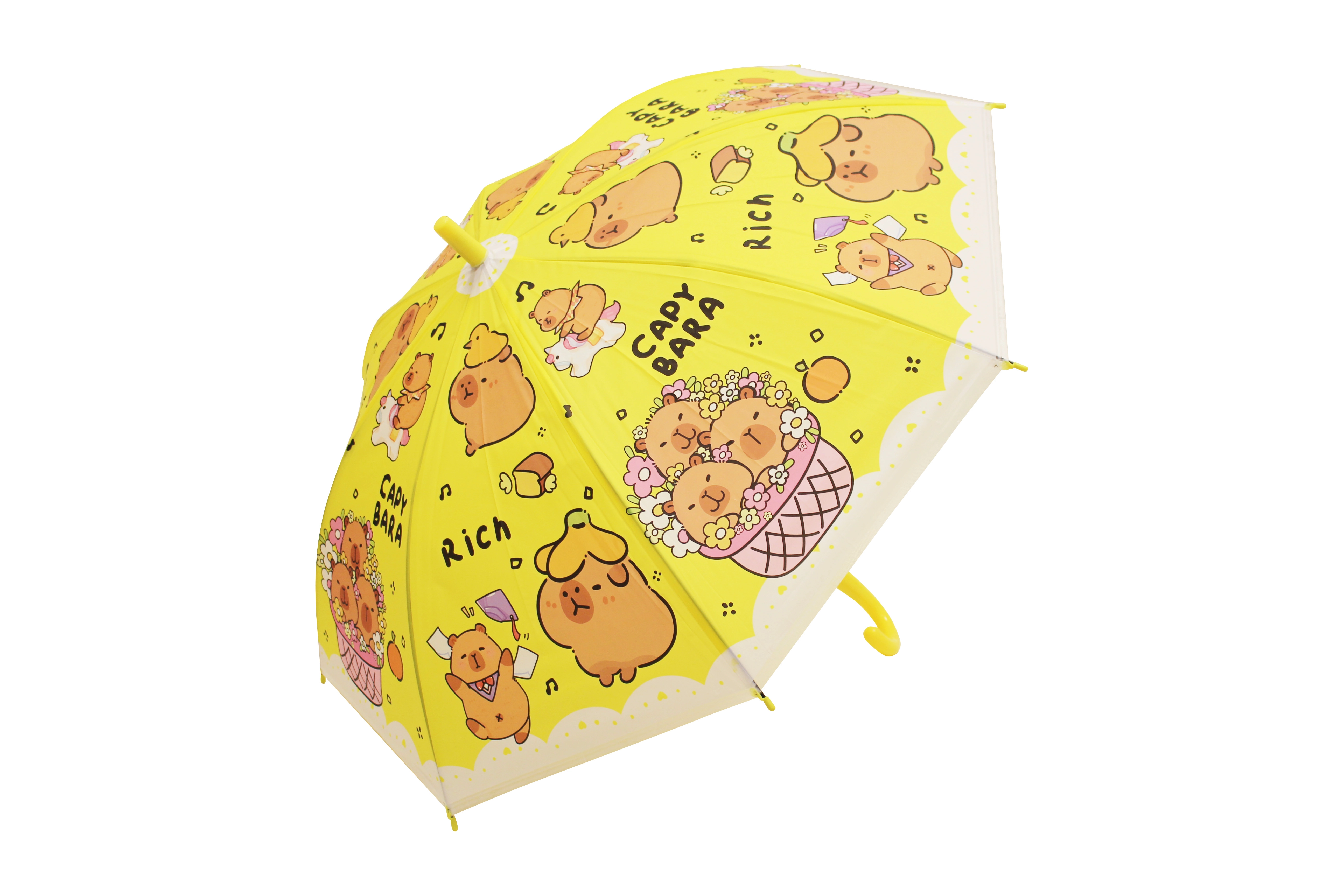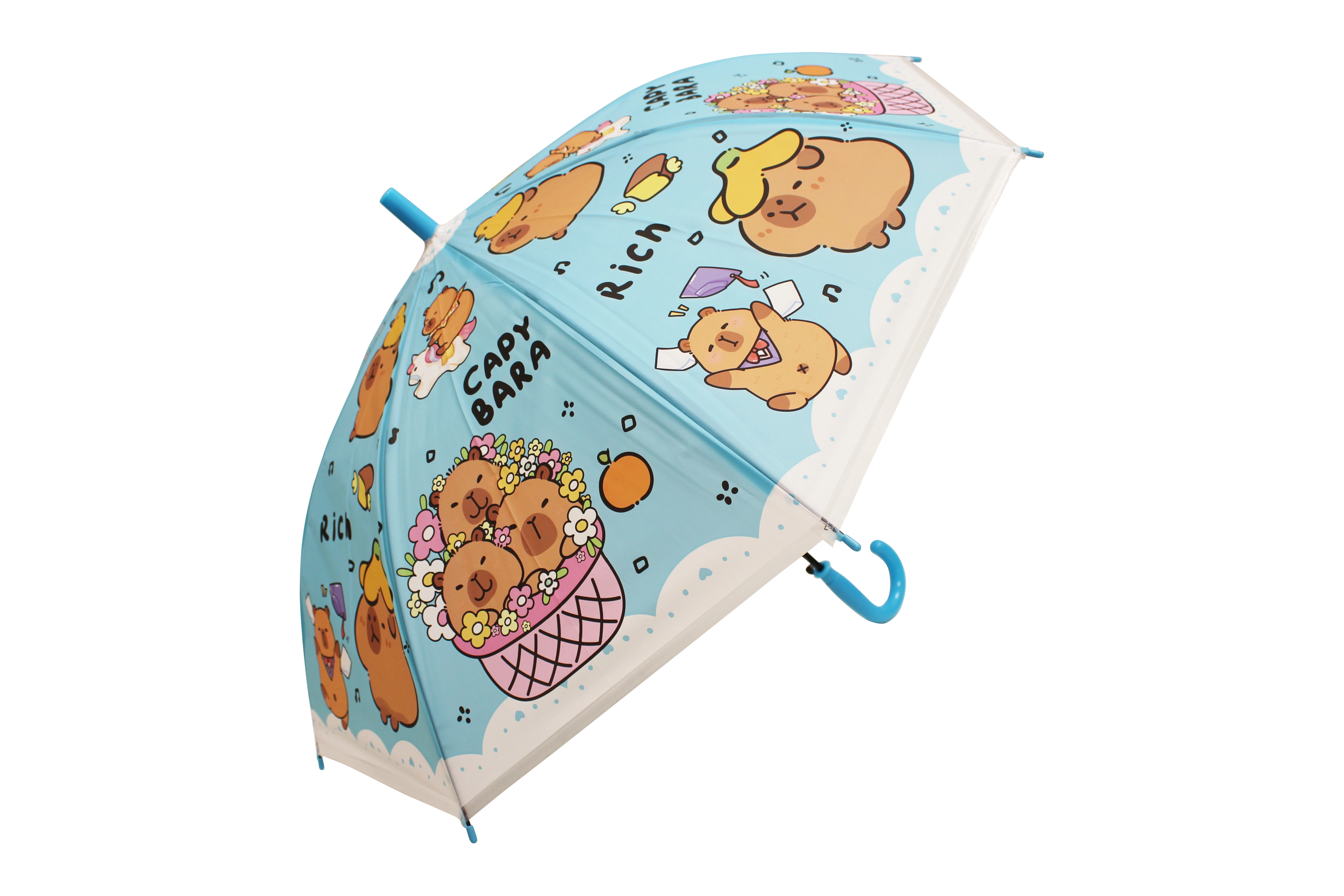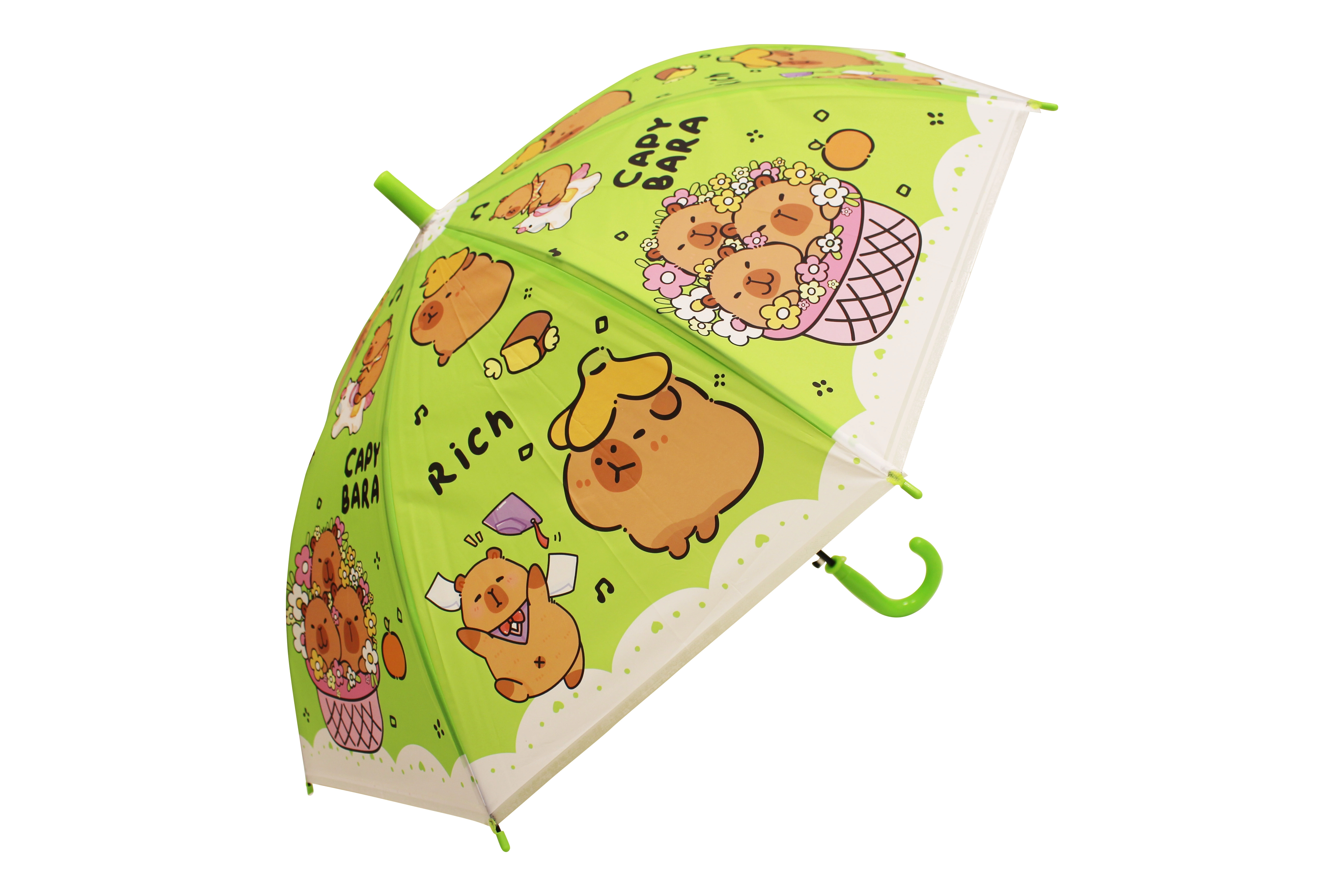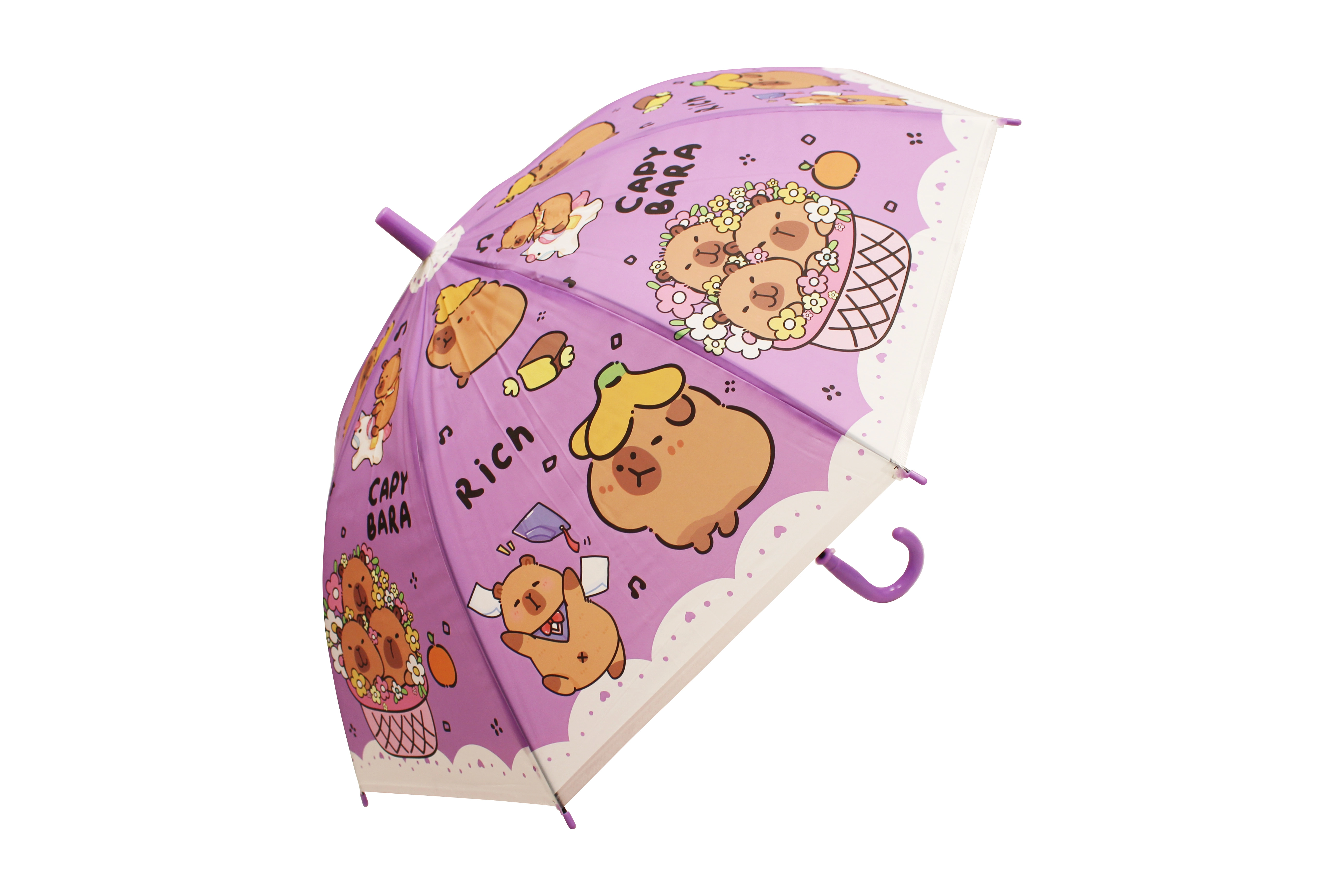 Cuki gyerek esernyő kapibara motívummal, amely megvéd az esőtől és feldobja a mindennapokat. Négy színben – kék, zöld, sárga és lila – kényelmes, ívelt fogantyúval és könnyű szerkezettel a könnyű hordozhatóságért. Ideális gyerekeknek a biztonságos kialakítás és a játékos kapibarás dizájn miatt.
