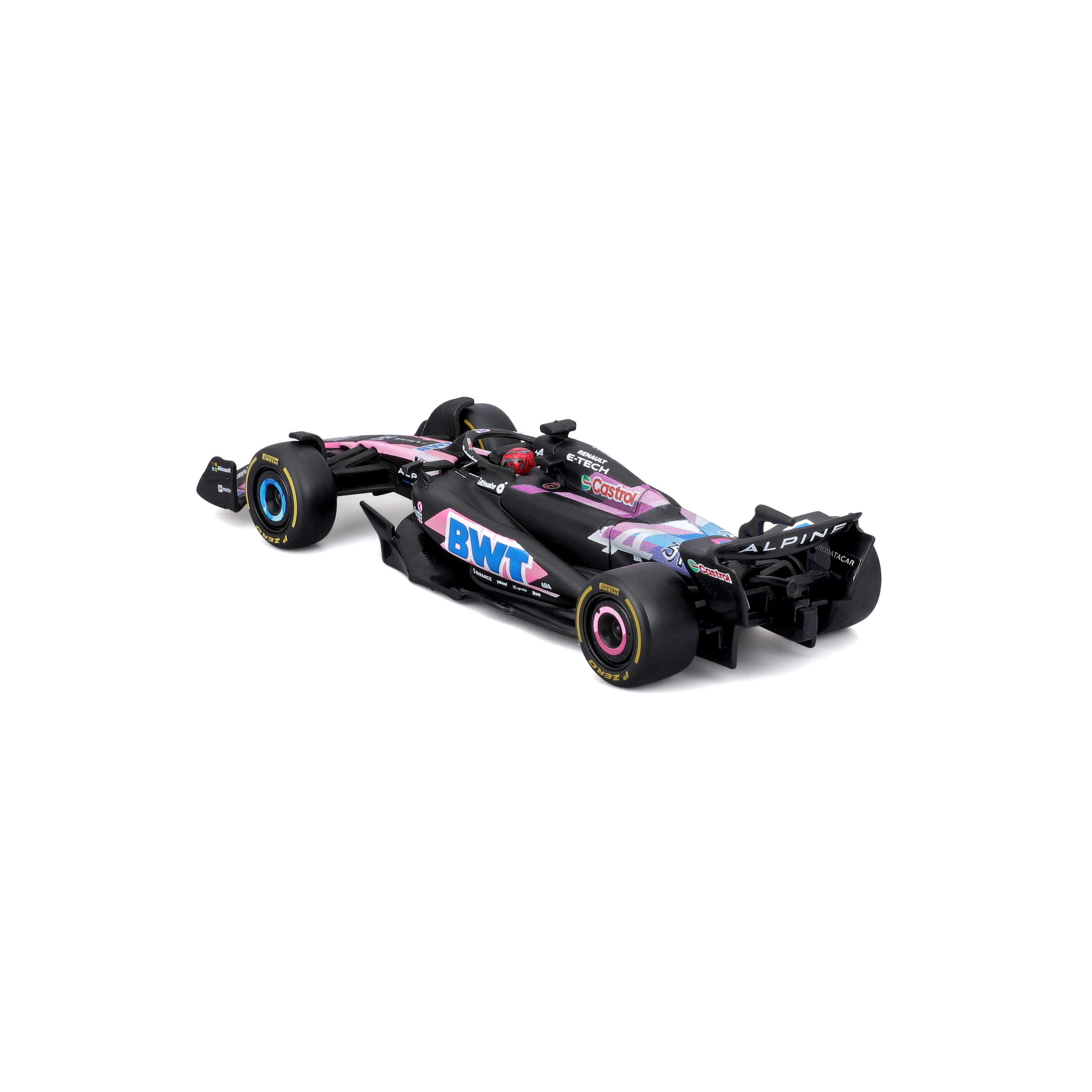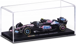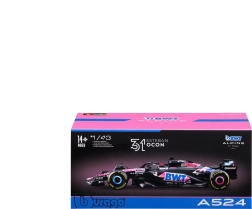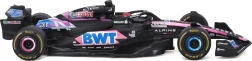 A Bburago hivatalosan licencelt Alpine F1 Team A524 (2024) modellje 1:43 méretarányban a kiváló kidolgozást és hitelességet ötvözi. A fekete alap rózsaszín–kék BWT akcentusokkal, finom szponzornyomatokkal és aerodinamikai elemekkel – beleértve az első szárnyat, a halo-t és a hátsó szárnyat – pontosan idézi Esteban Ocon valódi versenyautóját.
