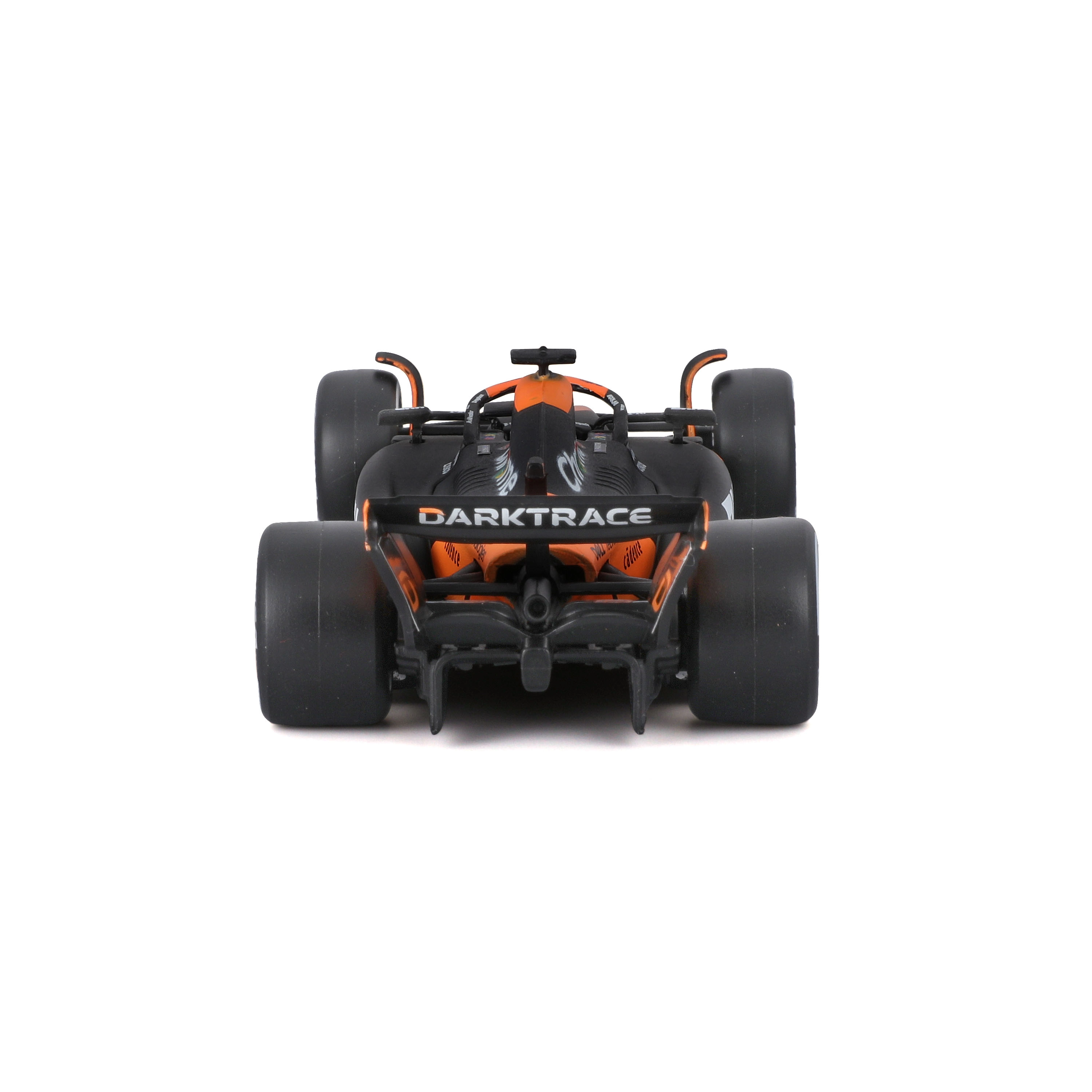 Hű narancs–fekete színvilág, pontos csapatlogók és színes kerékagyak emelik ki a valódi F1-es autó versenykarakterét.