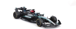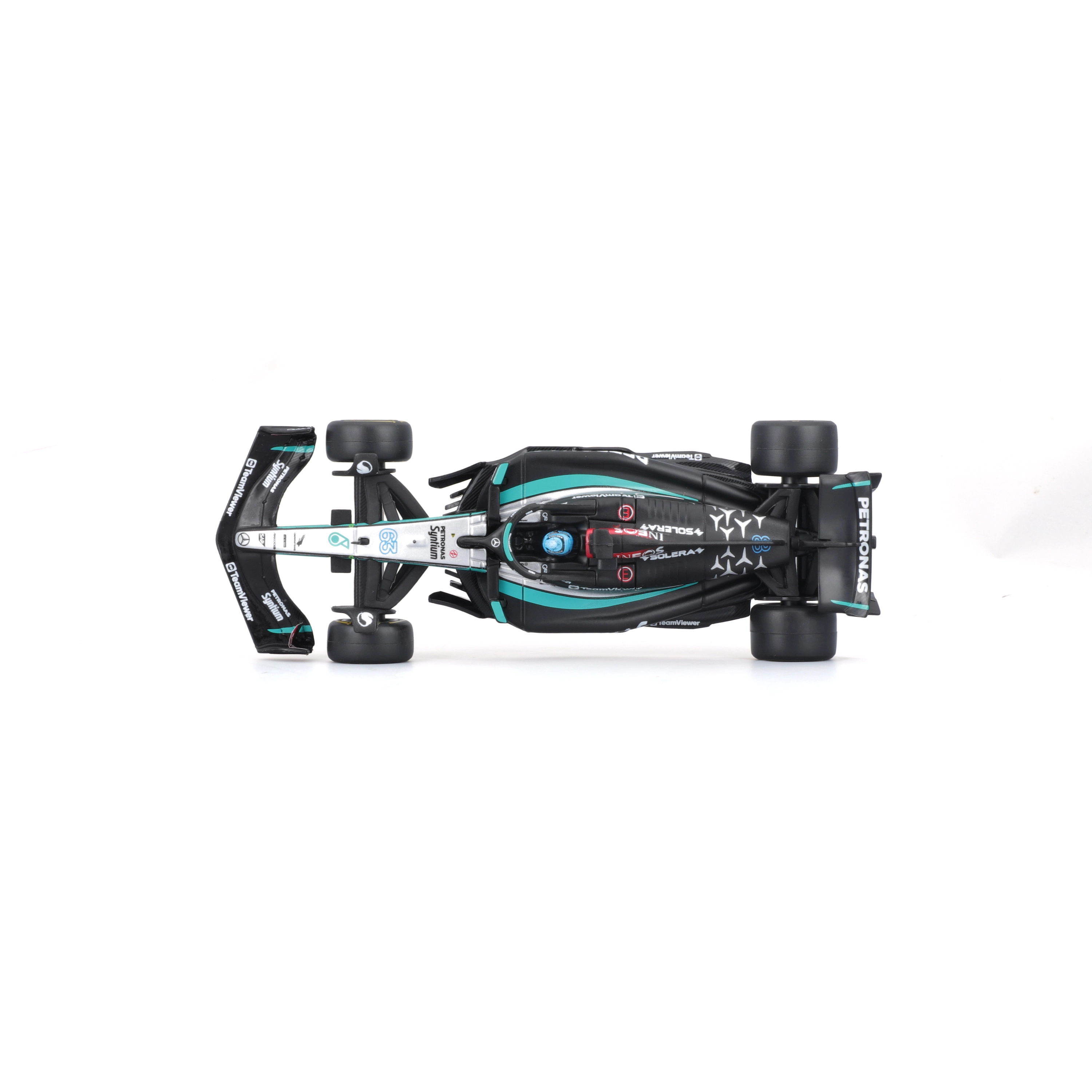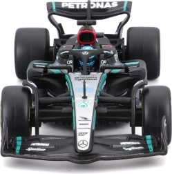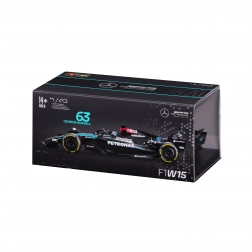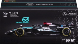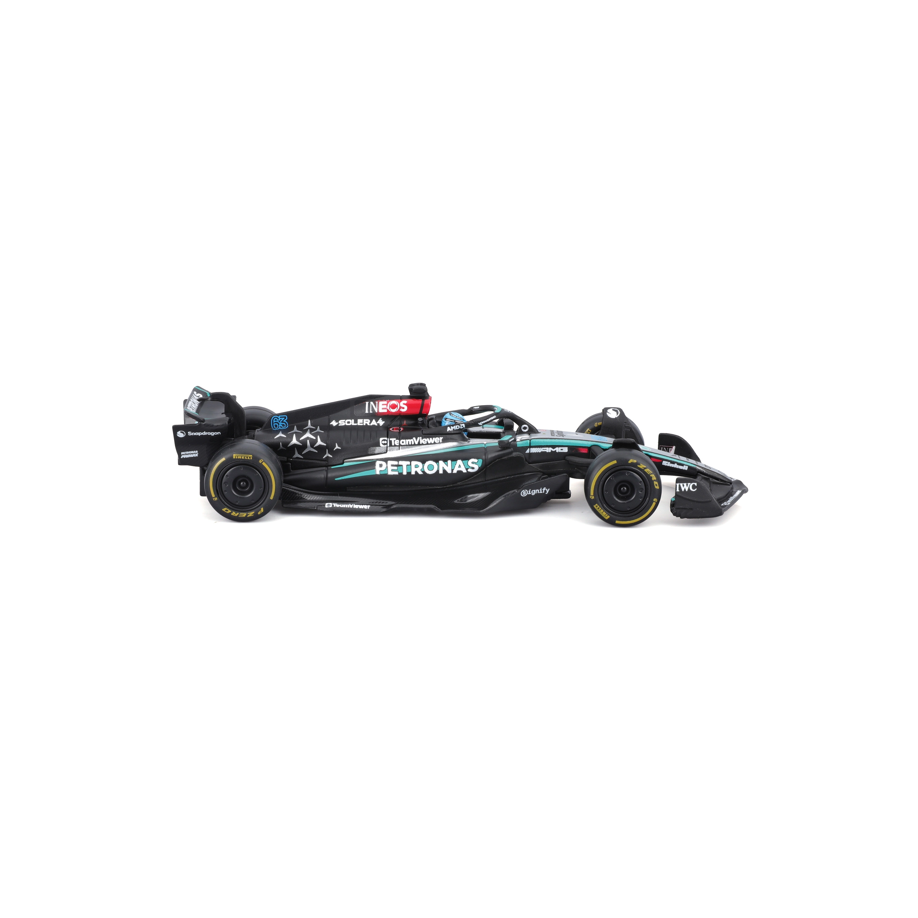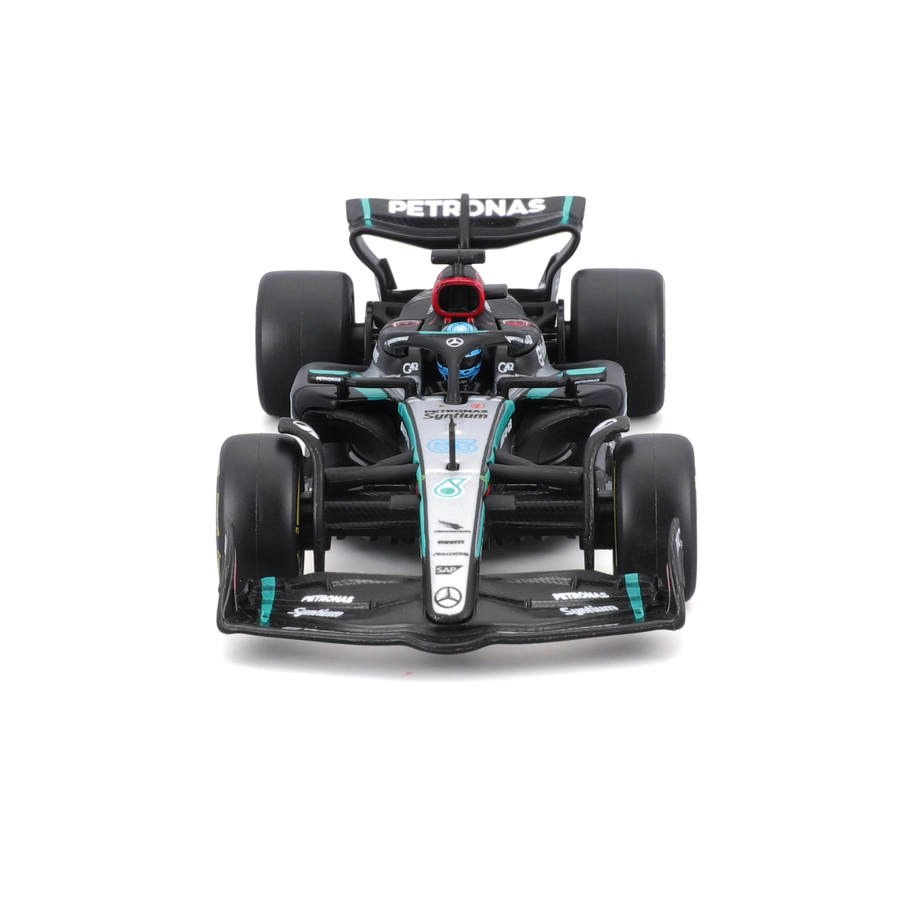 Precíz festés, aerodinamikai elemek és hű arányok adják vissza a MERCEDES‑AMG PETRONAS F1 W15 2024-es szezonbeli autóját, 63-as rajtszámmal.