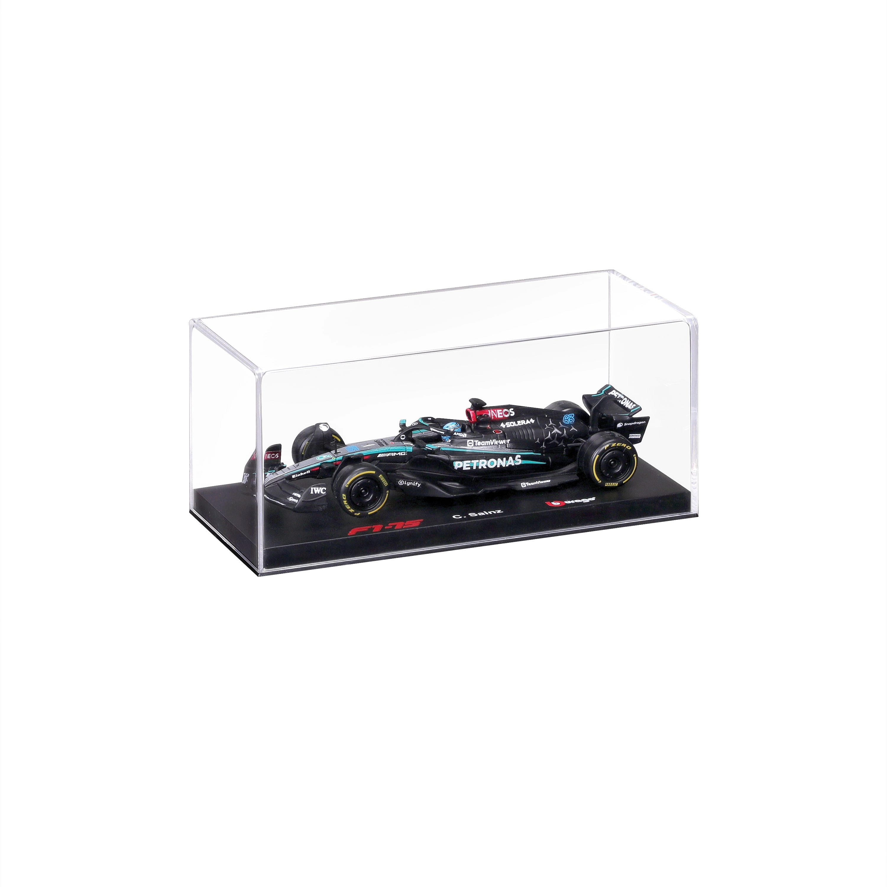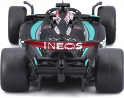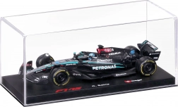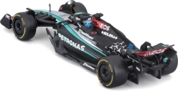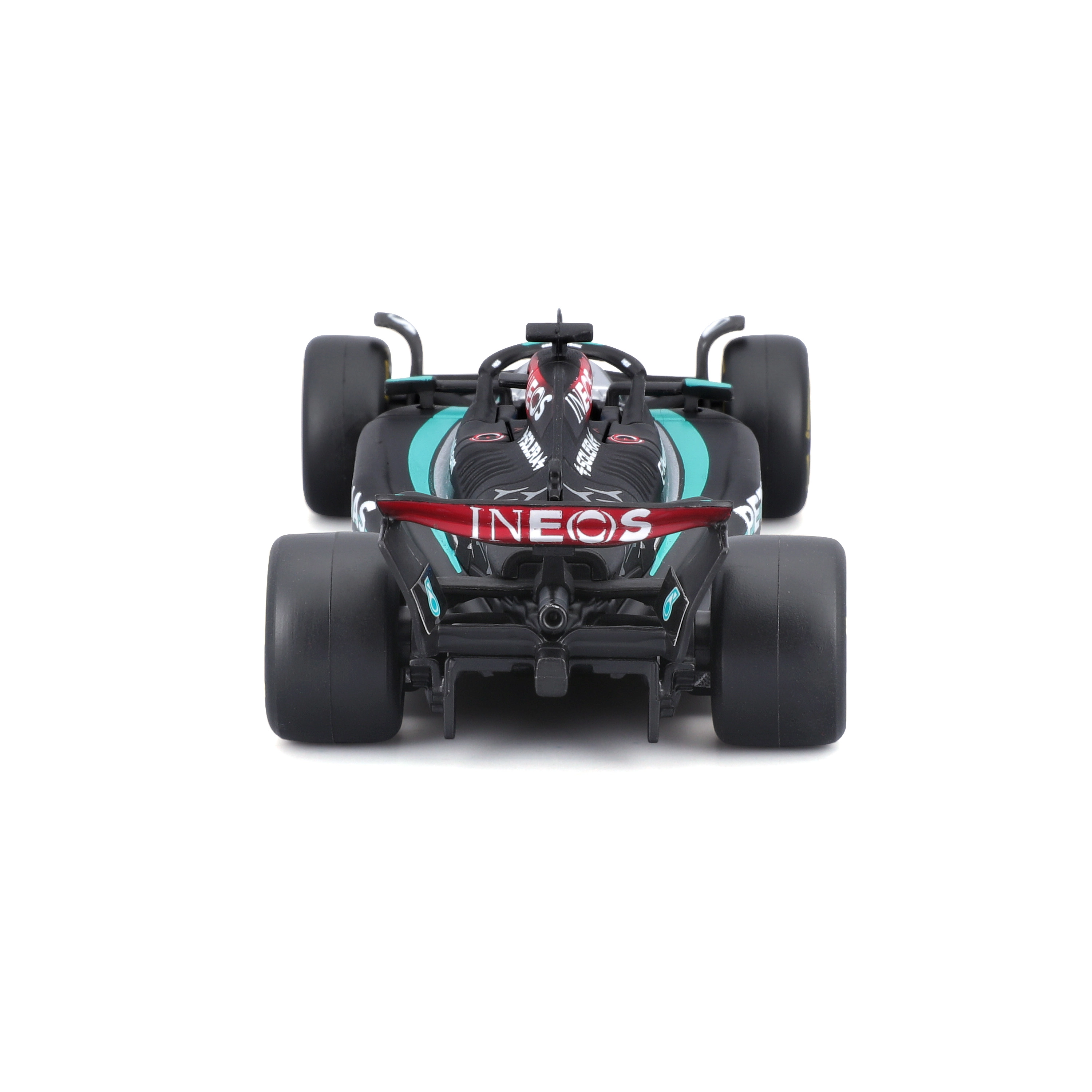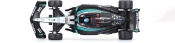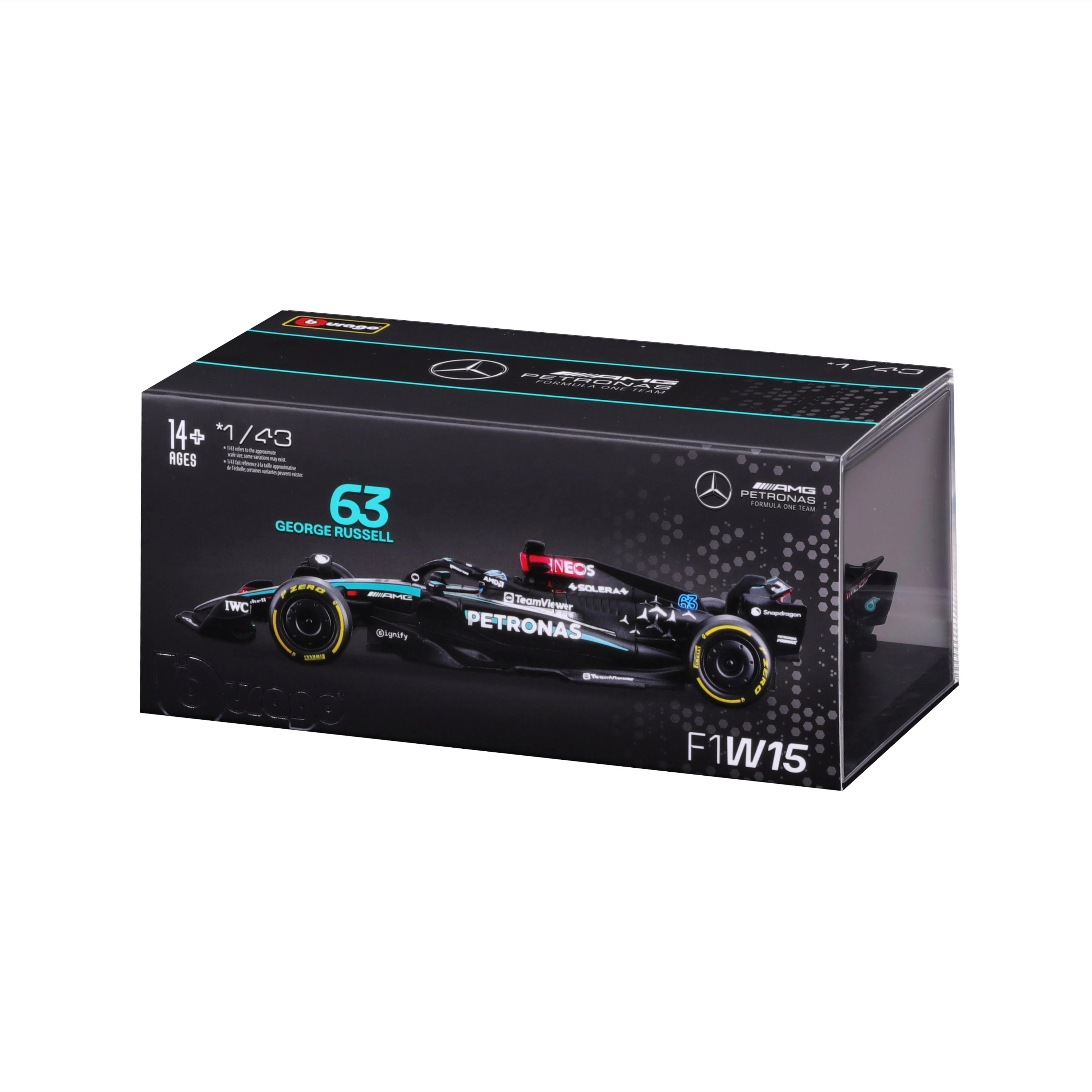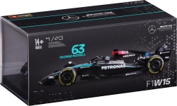 Precíz festés, aerodinamikai elemek és hű arányok adják vissza a MERCEDES‑AMG PETRONAS F1 W15 2024-es szezonbeli autóját, 63-as rajtszámmal.