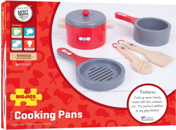 Ez a fa edénykészlet a Bigjigs Toys-tól tökéletes a fiatal szakácsok számára, akik szeretnének elkészíteni első fantasztikus ételeiket. Tartalmaz serpenyőket, fazekakat és konyhai eszközöket, amelyek javítják a kreatív játékot és a készségek fejlesztését.