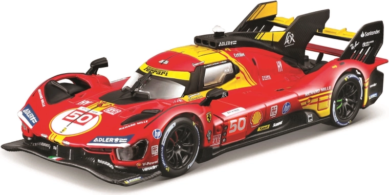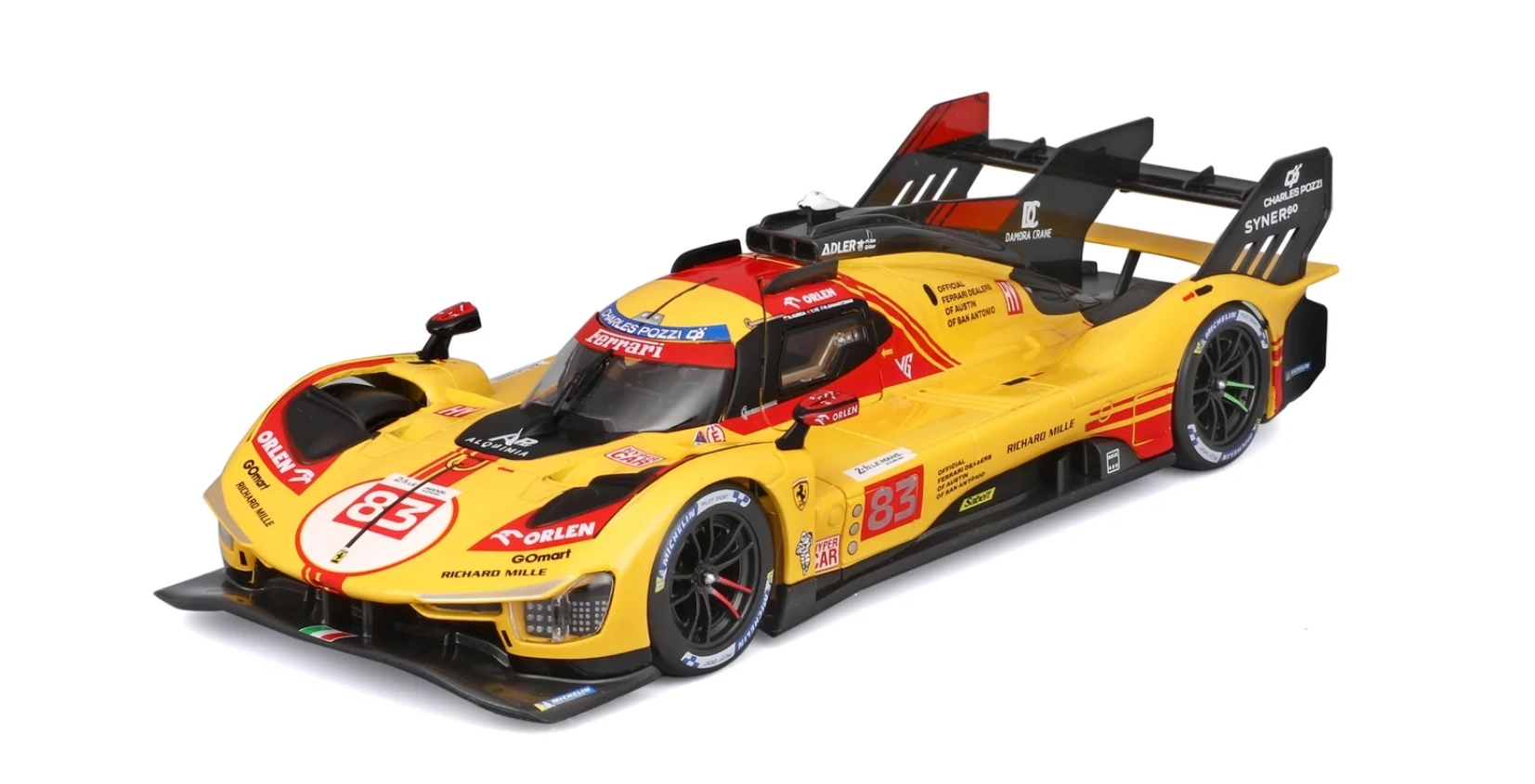 A Ferrari 499P modell 1:43 méretarányban a Bburago márkától hiteles arányokat, versenygrafikát és gondos részleteket kínál, amelyeket a 24h Le Mans 2024-en rajtszám 83-mal indult autó inspirált. Az átlátszó hardcase tok révén ideális a biztonságos kiállításhoz és a por elleni védelemhez.