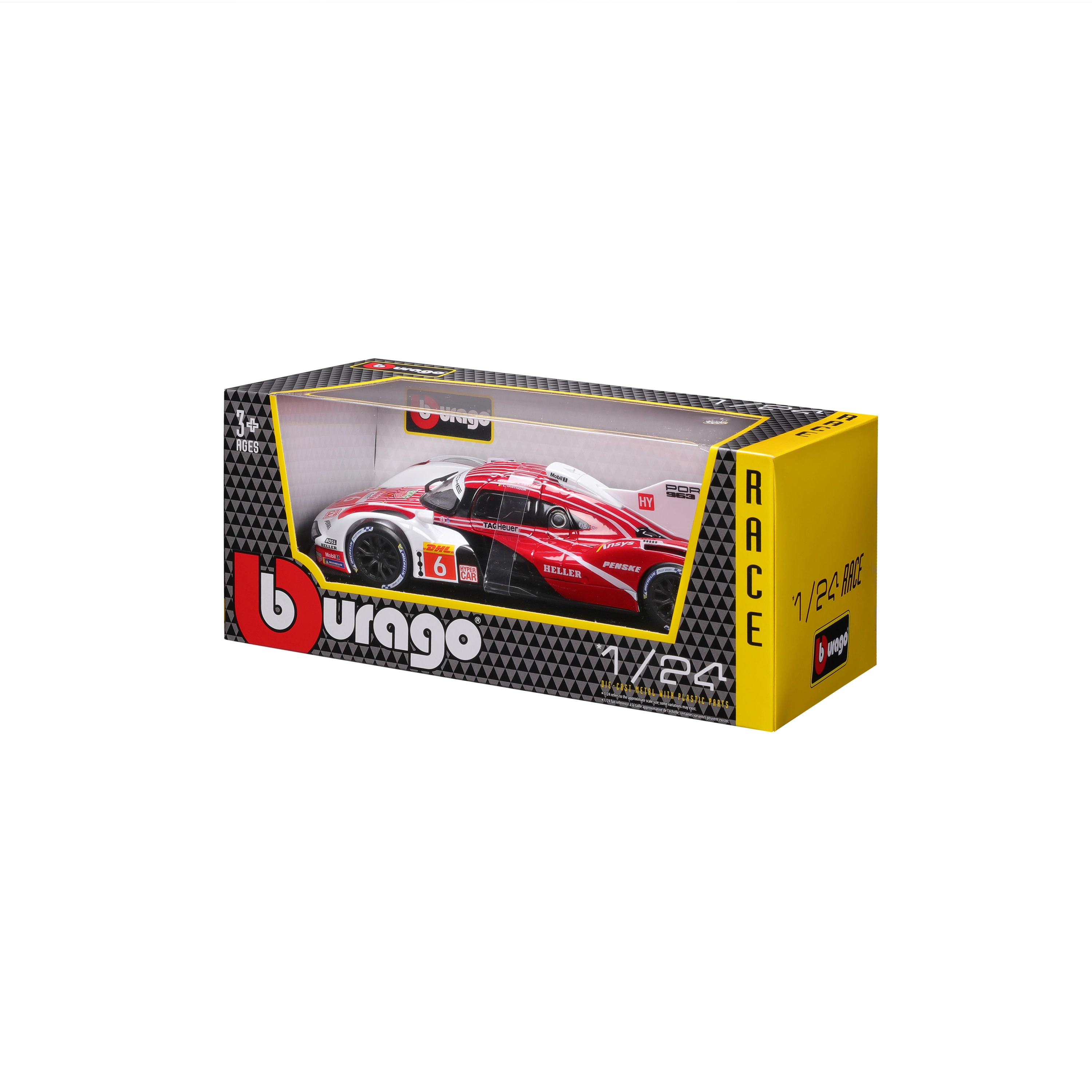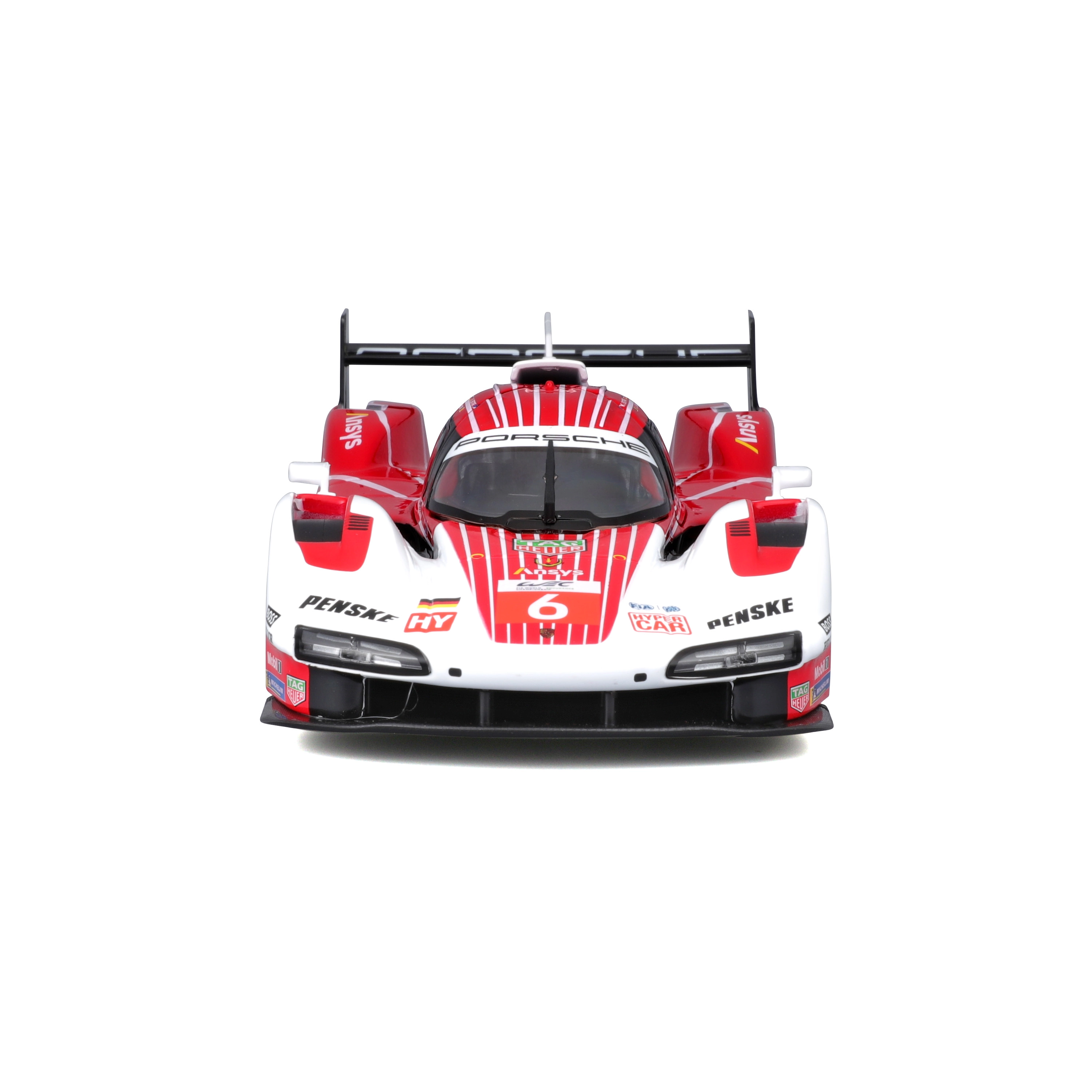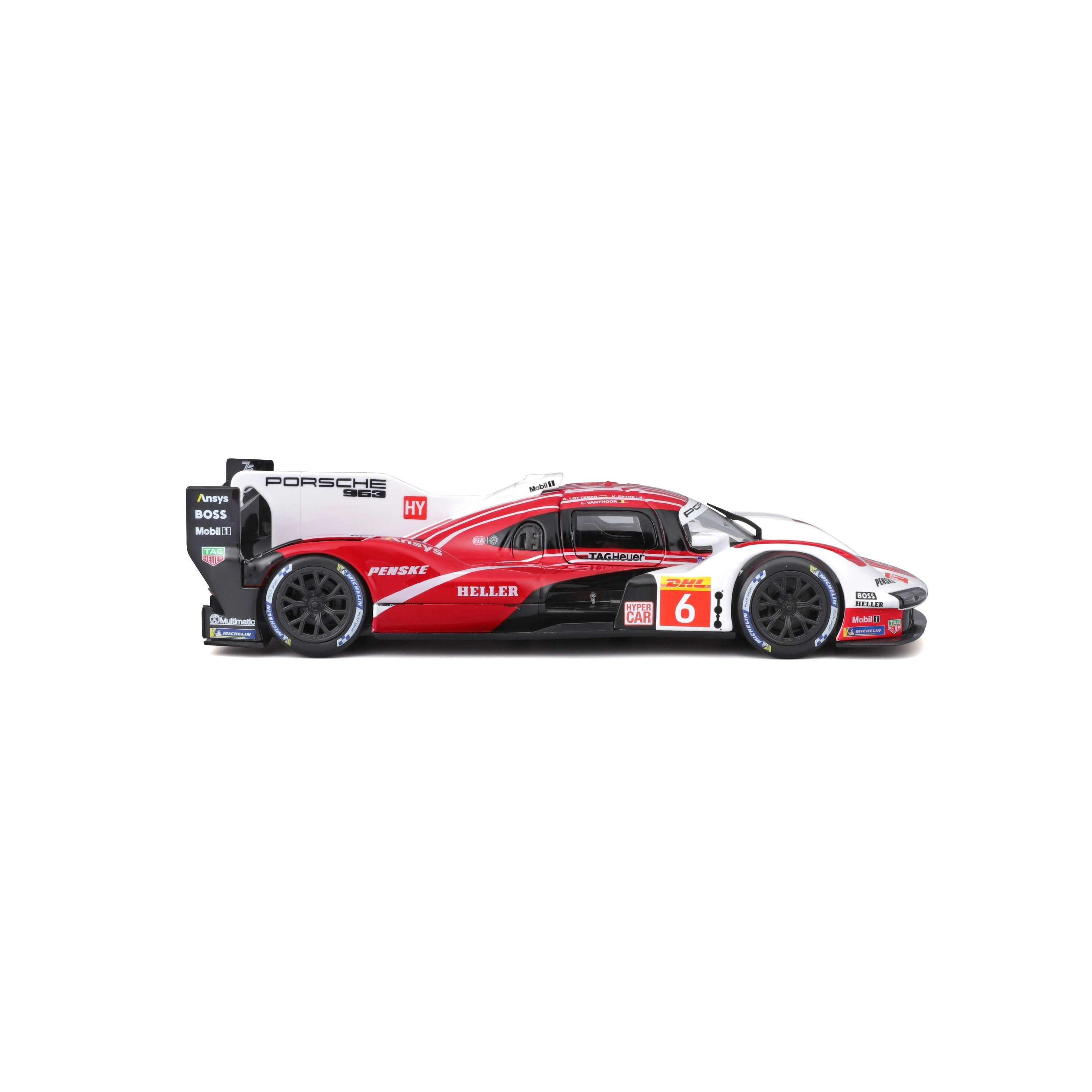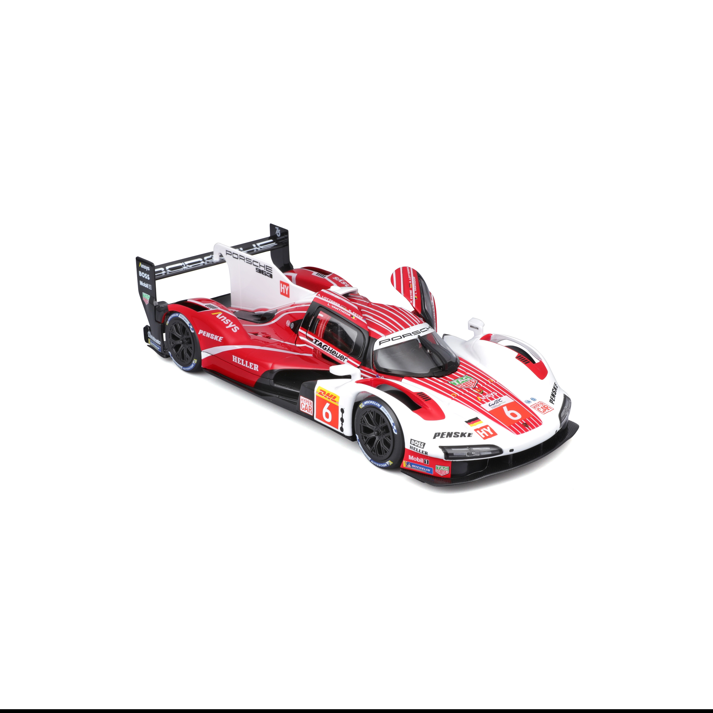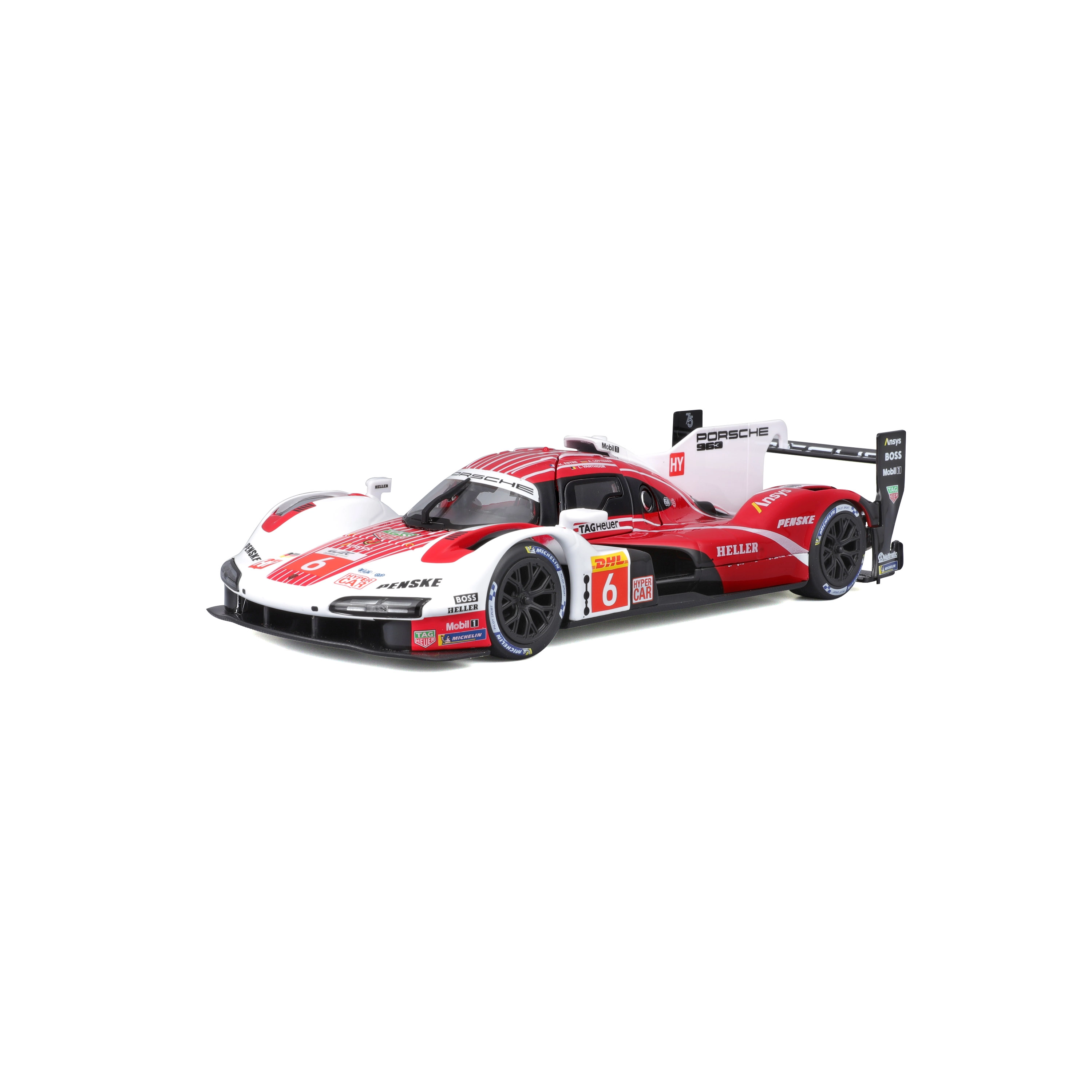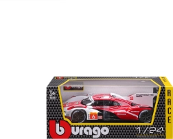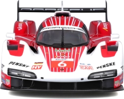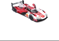 A Bburago 1:24 méretarányú modell hűen adja vissza a PORSCHE 963 (2024) hosszútávú versenyprototípus karakterét piros-fehér versenyszínezéssel és szponzorlogókkal. A fém karosszéria műanyag kiegészítőkkel, precíz vonalakkal és autentikus aerodinamikai elemekkel hangsúlyozza a gyűjtői értéket és a kiállított megjelenést.