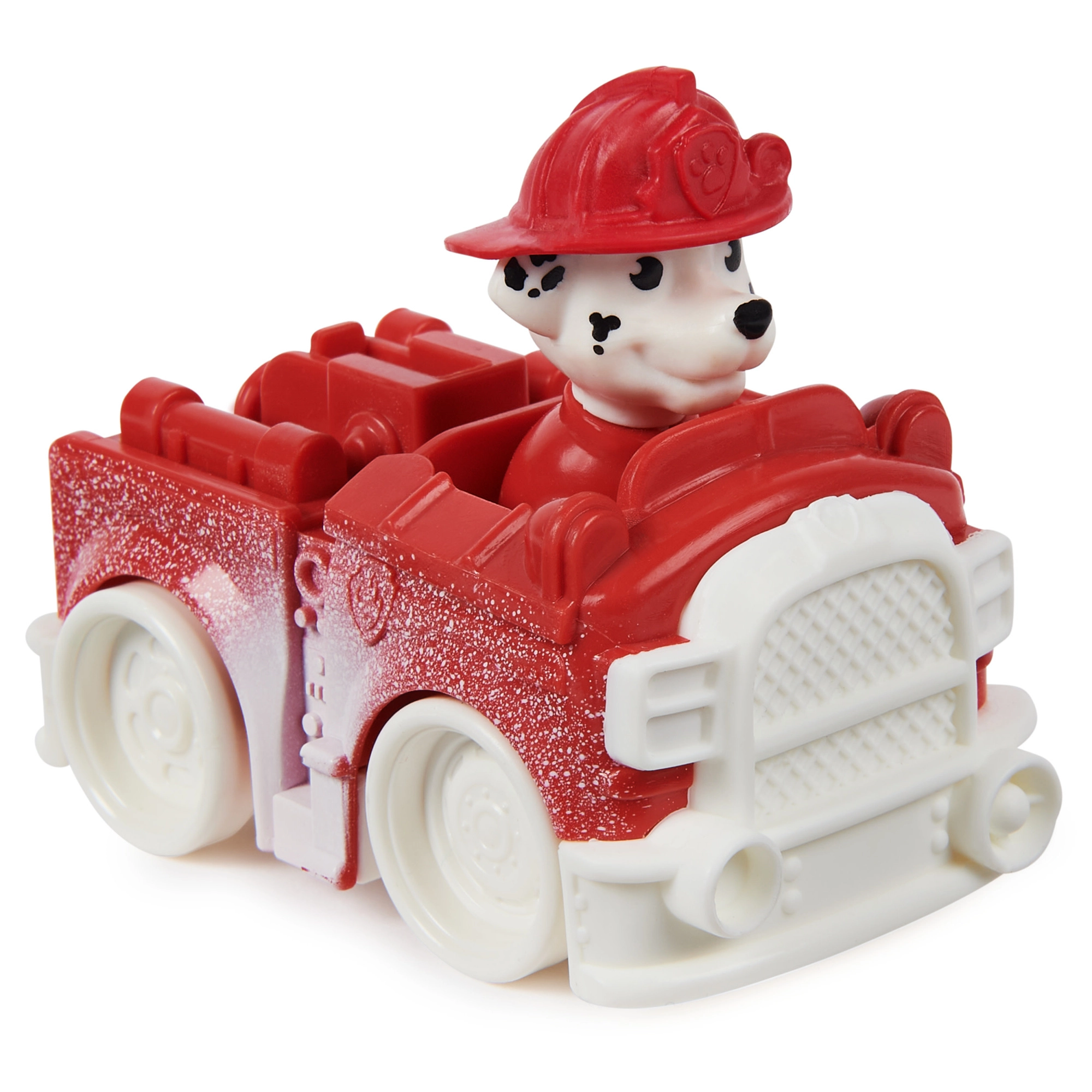 A piros autón lévő fehér „havas” elemek téli hangulatot kölcsönöznek a játéknak és kiemelik Marshall tűzoltó szerepét.
