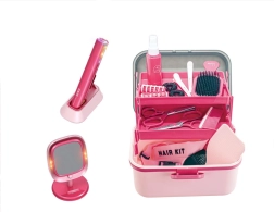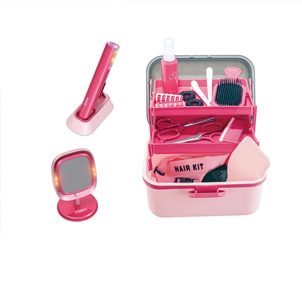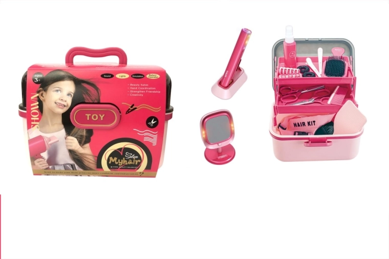 - Gyermek hajvasaló, töltőállvány, asztali tükör fényhatásokkal, rekeszes koffertáska, fésűk, kefék, olló, csatok, spray (játék)
