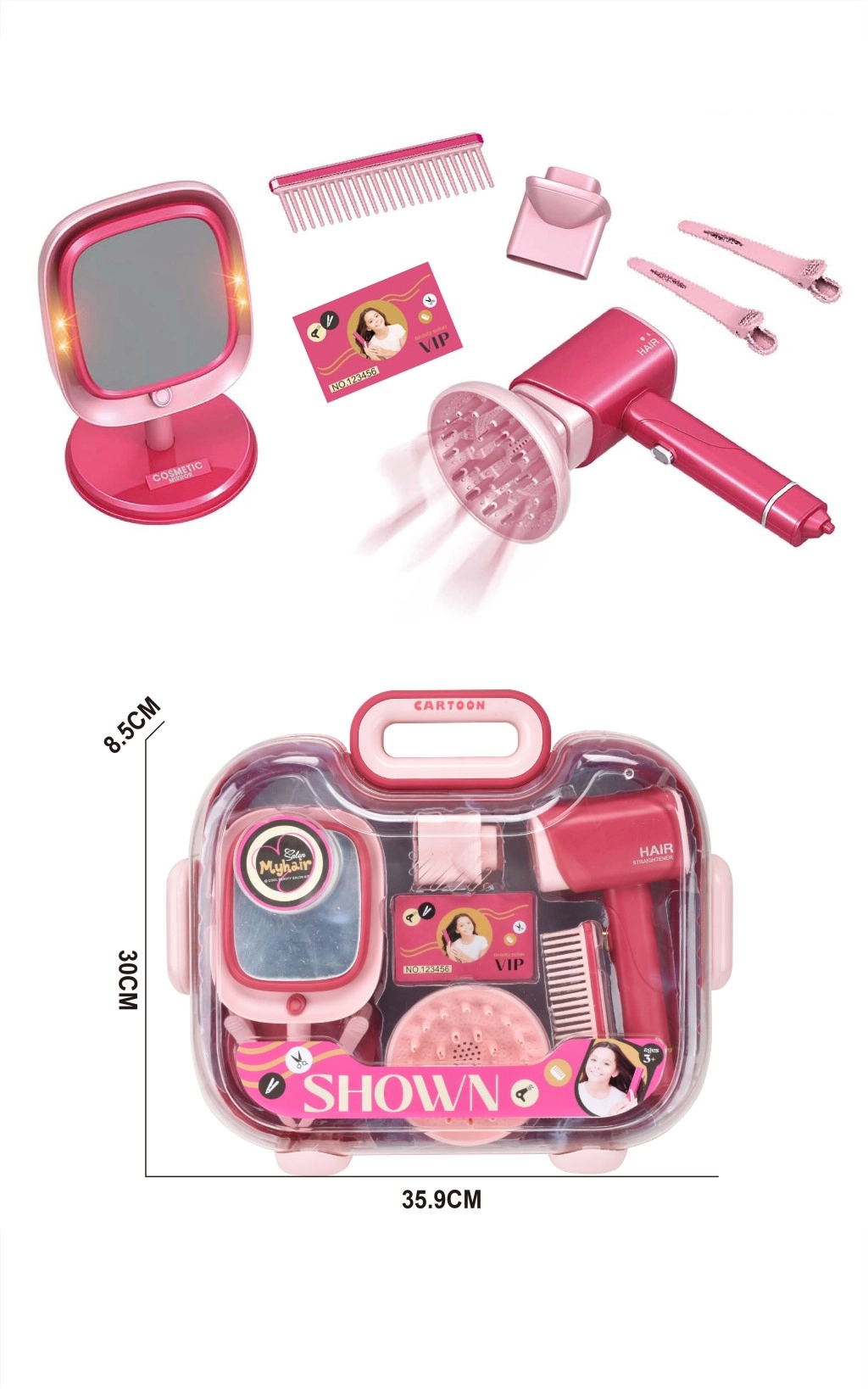 A gyermek hajstúdió tükörrel és hajszárítóval szórakoztató, gazdagon felszerelt készlet kis parádésoknak. A valósághű rózsaszín hajszárító diffúzorral fény- és hangeffekteket kínál, így úgy hat, mint egy igazi fodrászeszköz. A csomag része továbbá egy álló tükör oldalsó világítással, stabil talppal, rózsaszín–lila árnyalatokban.