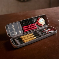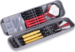 Teljes darts készlet otthoni szórakozáshoz és edzéshez. Tartalmaz 3 kész, 17 g-os sárgaréz nyilat, póthegyeket, szárakat és tollakat, valamint egy praktikus tokot. Barázdált (knurled) markolat a biztos fogásért és pontos repülési ív a klasszikus szizál táblákon.