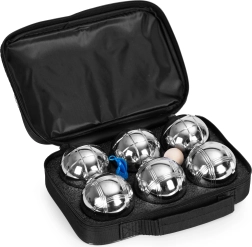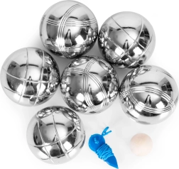 A készlet 6 tartós, krómozott acélgolyót tartalmaz 72 mm átmérővel és kb. 700 g tömeggel a kényelmes, stabil dobáshoz. Kétféle rovátkaminta segíti a golyók megkülönböztetését játék közben. A fa cochonnet szolgál célként, a mérőzsinór pedig igazságosan eldönti a vitás helyzeteket.