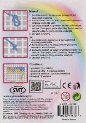 - Teljes készlet – műanyag lap/keret, papír minta, tű és 6 pamutfonal.