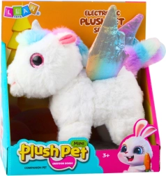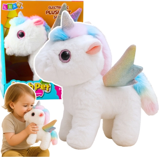Ez a plüss unikornis kellemesen puha anyagból készült, és részleteivel varázsol el: a csillogó ezüstszarv, a pasztellszínű sörény és farok, valamint a szivárványos szárnyak mesés megjelenést teremtenek. Az interaktív funkciók támogatják a gyermekek képzeletét, koordinációs készségeit, és ösztönzik az aktív játékot.