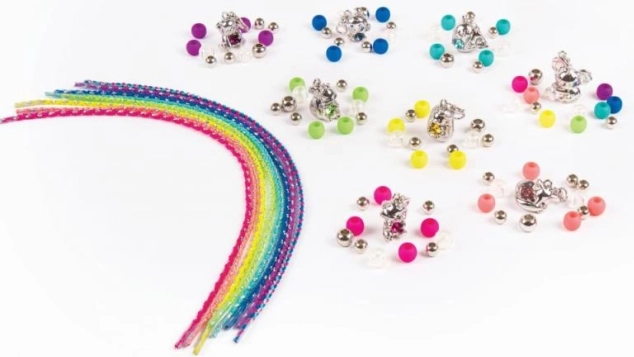 Tartalmaz egy, a figurához illő színű fonott zsinórt és 11 színes gyöngyöt. Könnyű felfűzés, kényelmes viselet és állítható méret gyerekcsuklóra.