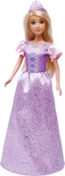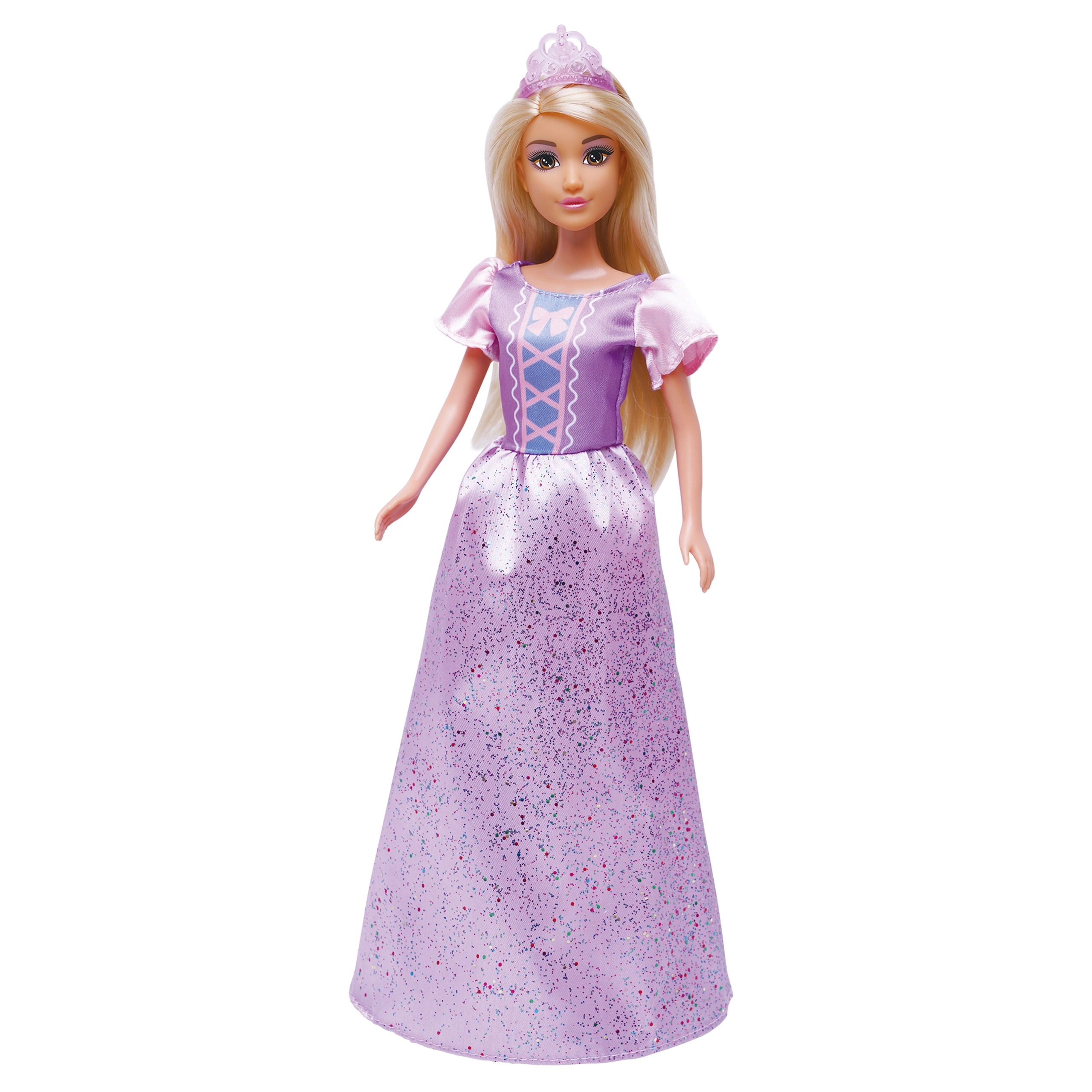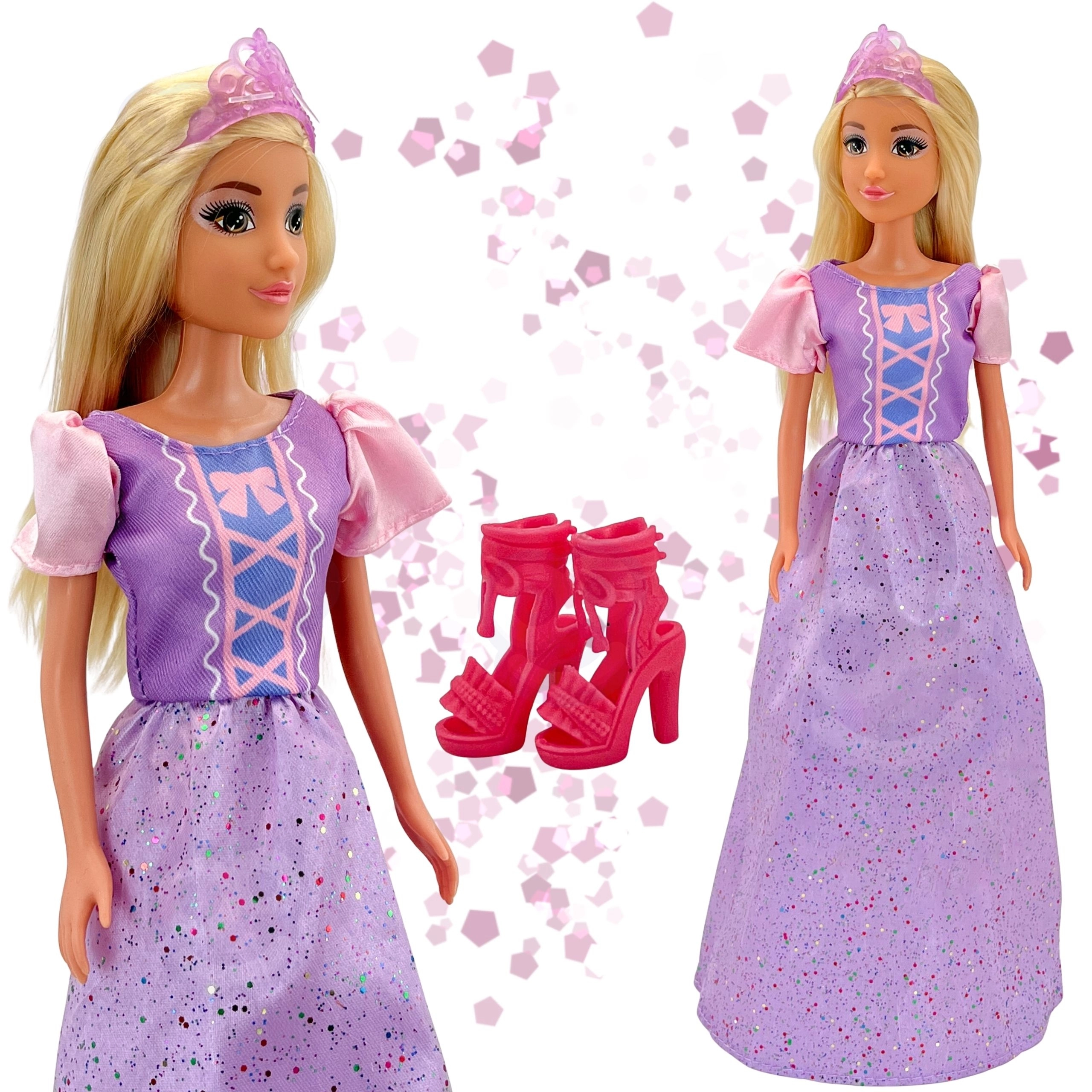 Hosszú lila–rózsaszín szoknya csillámokkal, díszes felsőrész és puffos ujjak – minden játékot királyi hangulattal töltenek meg.
