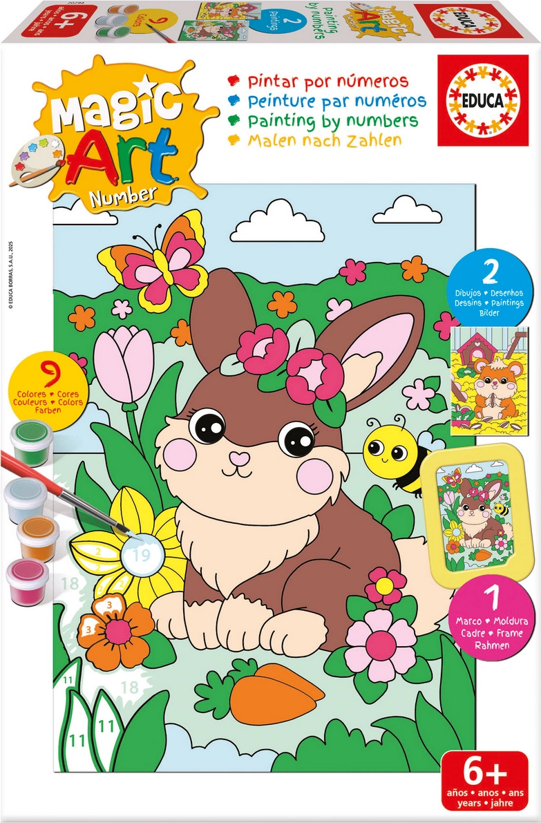 Fedezze fel a könnyű és szórakoztató festést az EDUCA Számok szerinti festés – Nyúl és Hörcsög készlettel. Váljon egy időre festővé, és készítsen saját képet a számok útmutatása alapján. A készlet egyszerű folyamatot, koncentráció- és koordinációfejlesztést, valamint teljes tartozékkészletet kínál az azonnali alkotáshoz.