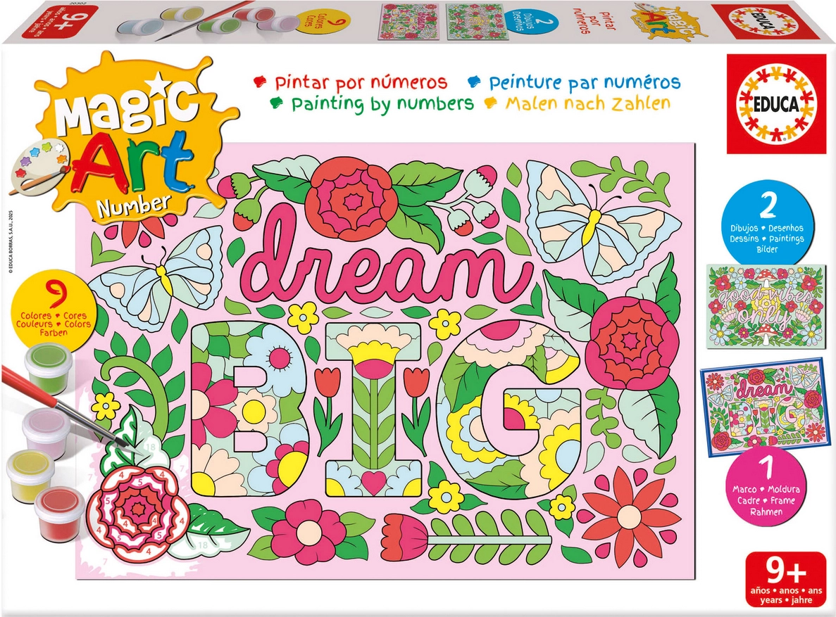 Fedezze fel az alkotás örömét az Educa szám szerinti festés – virágok készlettel. Az előrenyomtatott szegmenseknek és a mellékelt festékeknek köszönhetően a festés egyszerű, szórakoztató, és kezdőknek is megfelelő. A tevékenység fejleszti a koncentrációt, a koordinációt és a színek felismerését.