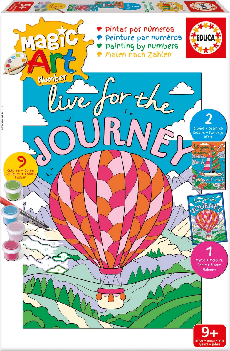 Ez a kreatív EDUCA készlet egyszerűvé és örömtelivé teszi a festést. A vásznon minden szám egy konkrét színnek felel meg, így könnyedén elkészíthető egy látványos kép a hajóról és a hőlégballonról. Minden szükséges tartozék megtalálható benne – a festékektől a keretig – így azonnal kezdhet alkotni.