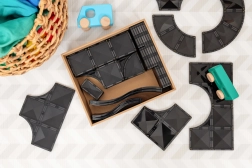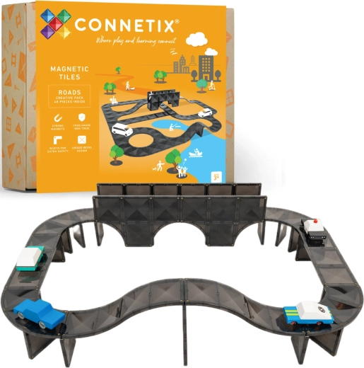A Connetix Roads Creative Pack áttetsző, masszív útelemeket kínál elegáns sötét színben, amelyek erős neodímium mágneseknek köszönhetően finoman illeszkednek egymáshoz. A gyerekek rámpákat, kanyarokat, kereszteződéseket és hidakat építhetnek, és fából készült autókkal közlekedhetnek rajtuk. Játék közben természetes módon gyakorolják a logikus gondolkodást, a motorikát és a fizika és geometria alapjait.