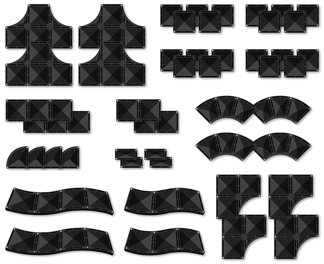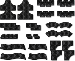 - 4× rámpa, 4× visszafordító, 4× T-elem, 4× R kereszteződés, téglalap és négyzet elemek, 4× negyedkör, 4× kis téglalap, illusztrált inspirációs füzet