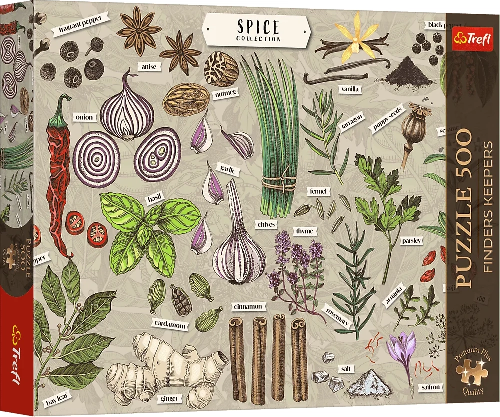 Merüljön el az ízek világában a Finders Keepers: Fűszerek motívummal, amely egy kultúrtérképre emlékeztető illusztráció gyógynövényekkel, zöldségekkel és fűszerekkel. A TREFL Premium Plus sorozat precíz kidolgozást, modern csomagolást és gondosan válogatott, színeivel és hangulatával magával ragadó képeket kínál.