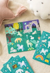 Ez a játékos készlet varázslatos világot tár a gyerekek elé, ahol unikornisokkal, szivárvánnyal, gombákkal, bagollyal és más erdei barátokkal rendezhetnek jeleneteket. A matricák könnyen felragaszthatók és visszaszedhetők, így a kedvenc történetek újra és újra életre kelthetők.