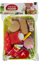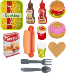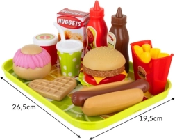 - tálca, ketchup, csokoládészósz, hot dog kifli, virsli, evőeszközök (kanál, kés, villa), nuggetek, dzsem, pohár szívószállal, doboz hasábburgonyához, 5× hasáb, 2× burgerzsemle, gofri, hagyma, saláta, paradicsom, húspogácsa, sajt, cupcake, öntet