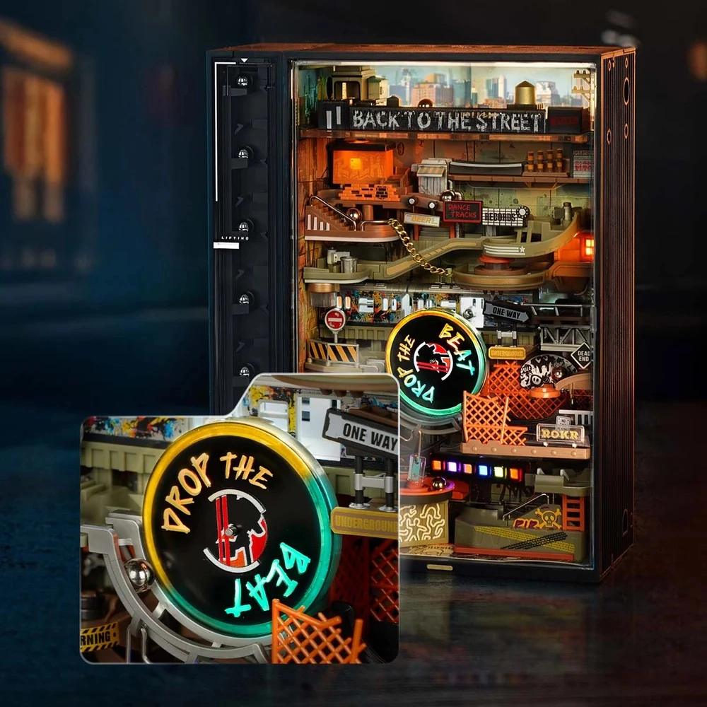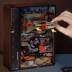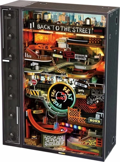A lüktető hip‑hop utca miniatűr panorámája 233 cm hosszú pályán biztosítja a golyók egyenletes mozgását, melyet dinamikus neon LED világítás hangsúlyoz. A nagy nyomatékú, hatékony motornak köszönhetően a golyók megbízhatóan visszatérnek az automatikus felvonóval, így a látvány megszakítás nélkül folytatódik.