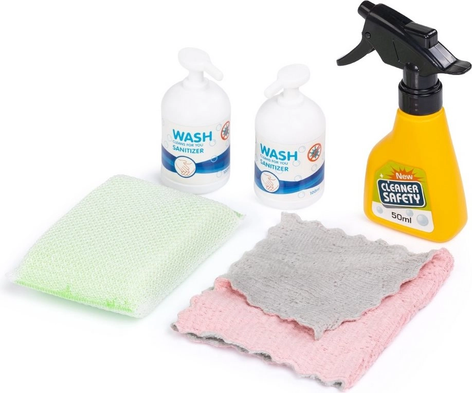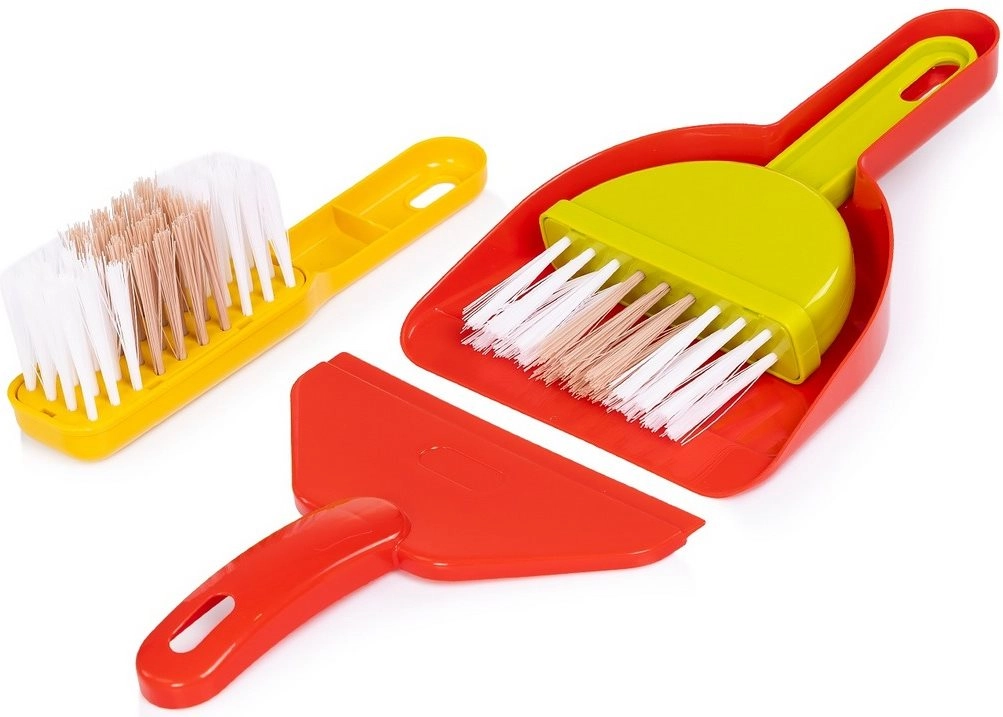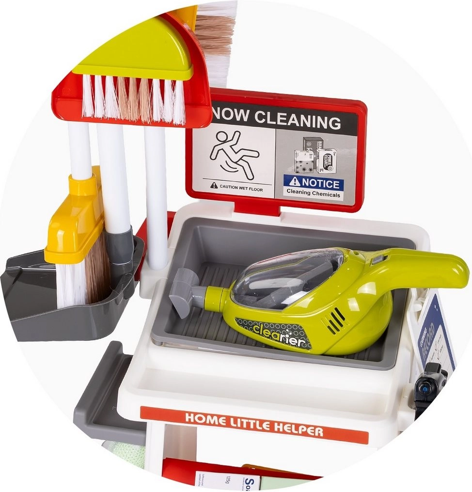 A csomag széles kiegészítő-választékot tartalmaz: porszívó, felmosó, seprű, kézi seprű és lapát, permetező palack, szivacs és kendők, továbbá figyelmeztető tábla és kosár (változattól függően). Minden a gyerekek kezéhez igazodik a biztonságos fogásért, és könnyen elhelyezhető a kocsin. A minőségi anyagok hosszú élettartamot biztosítanak gyakori használat mellett is.