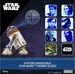 A legendás R2‑D2 droid fa modellként kel életre, hűen megragadva a STAR WARS világának ikonikus dizájnját. A felhúzómechanizmusnak köszönhetően a droid a „start/stop” karral aktiválva valóban megindul, és egyenletes mozgást mutat be, miközben a LED kivetítő színes jeleneteket vetít egy messzi‑messzi galaxisból. A diapozitívek biztonságosan a droid testében vannak elhelyezve, és a mellékelt eszközzel könnyen cserélhetők.