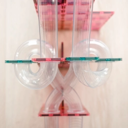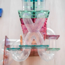 Az erős neodímium mágnesek és az átlátszó pasztell elemek lehetővé teszik magas tornyok, alagutak és tölcsérek létrehozását, amelyeken a golyók egyenletesen gurulnak végig.