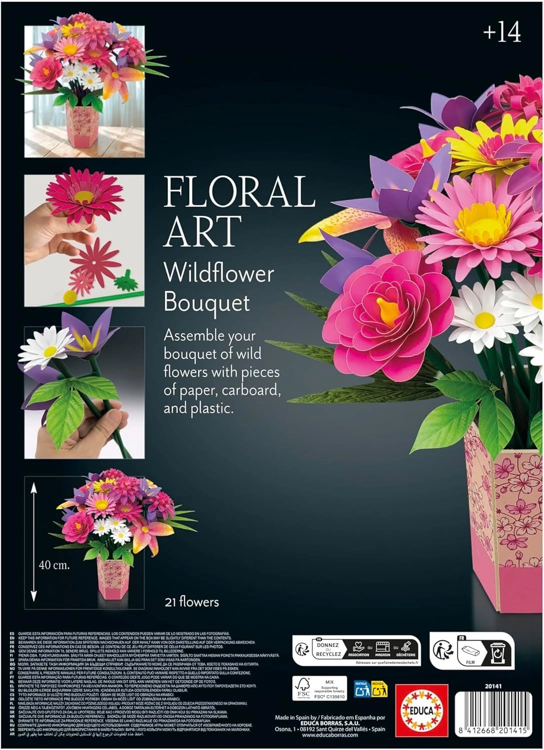 Fedezze fel az egyedülálló 3D puzzle EDUCA Floral Art – mezei csokrot, amely ötvözi a kreatív alkotást az elegáns dizájnnal. Állítsa össze saját dekoratív csokrát ragasztó és olló nélkül, környezetbarát anyagokból – ideális relaxációhoz, kézműveskedéshez, valamint stílusos otthoni dekorációnak vagy eredeti ajándéknak is.