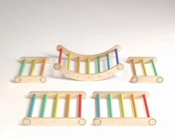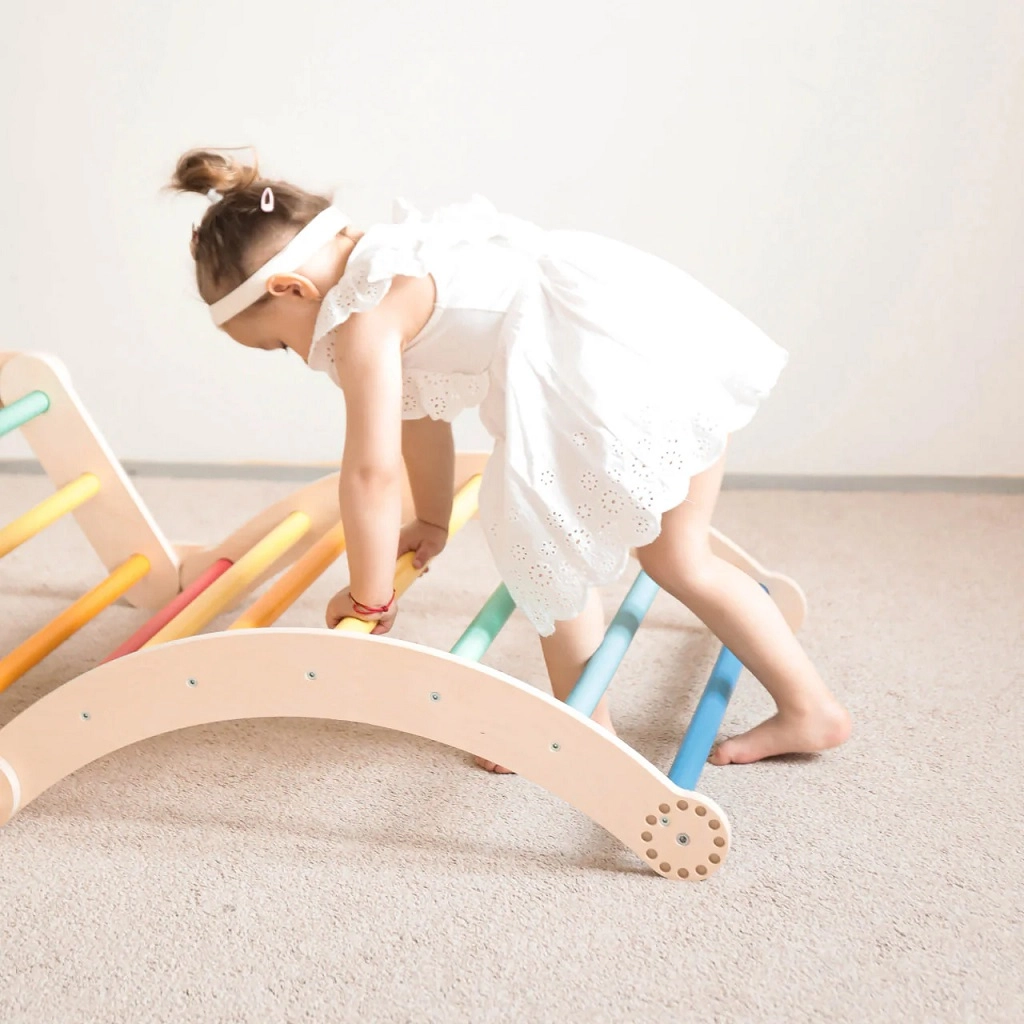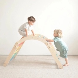 A készlet két mászó háromszögből (nagy és kicsi) és egy egyensúlyozó ívből áll, amelyeket egyszerűen össze lehet kapcsolni különféle formákká – híddá, alagúttá, létrává vagy házikóvá. A nyírfarétegelt lemez természetes erezete a finom szivárványos árnyalatokkal modern megjelenést ad a játéknak, és mozgásra ösztönzi a gyerekeket.