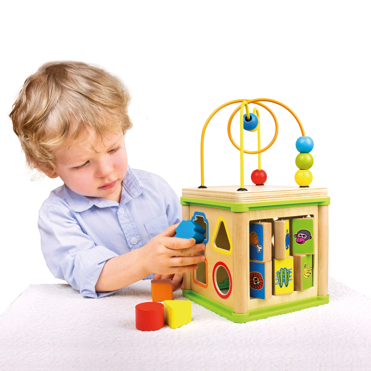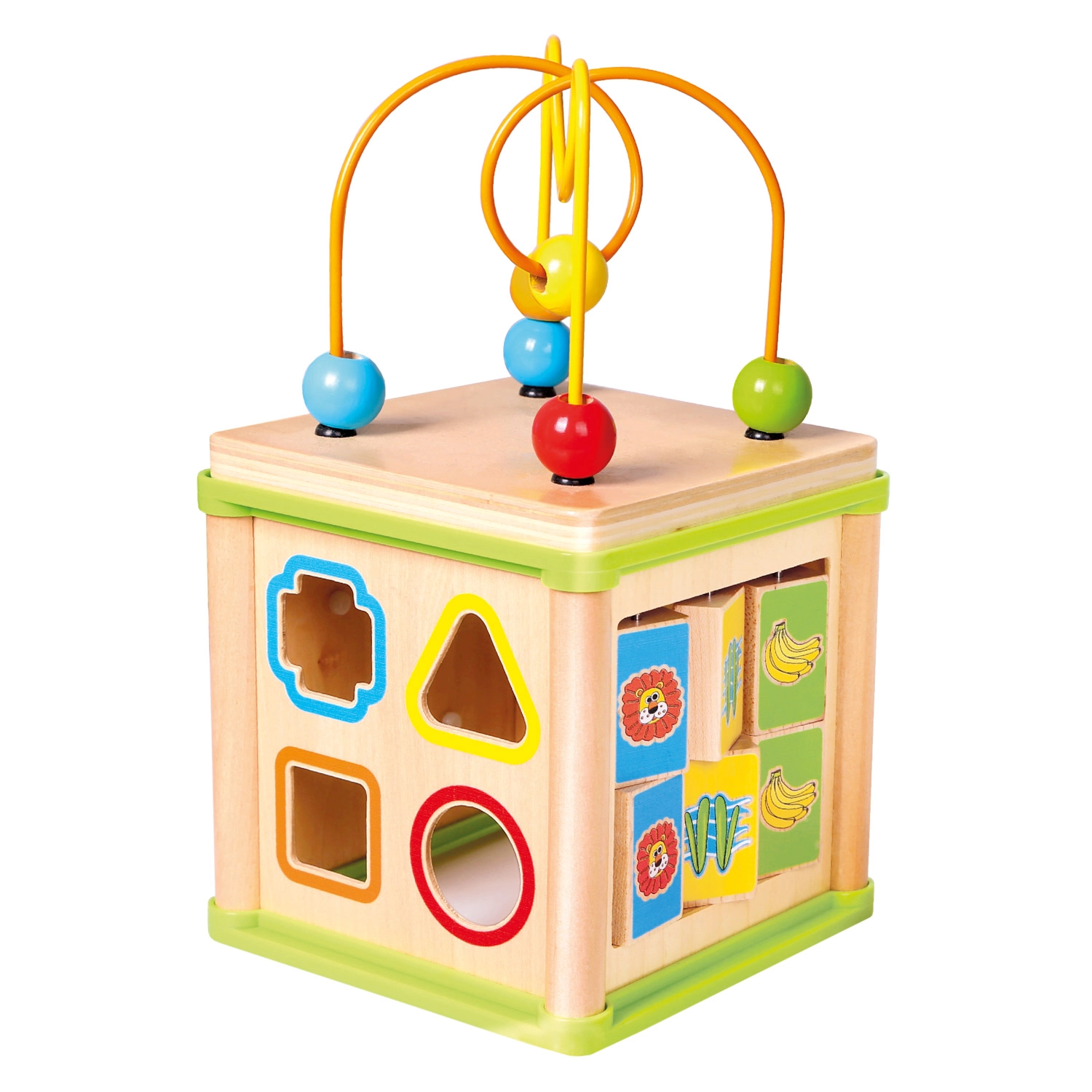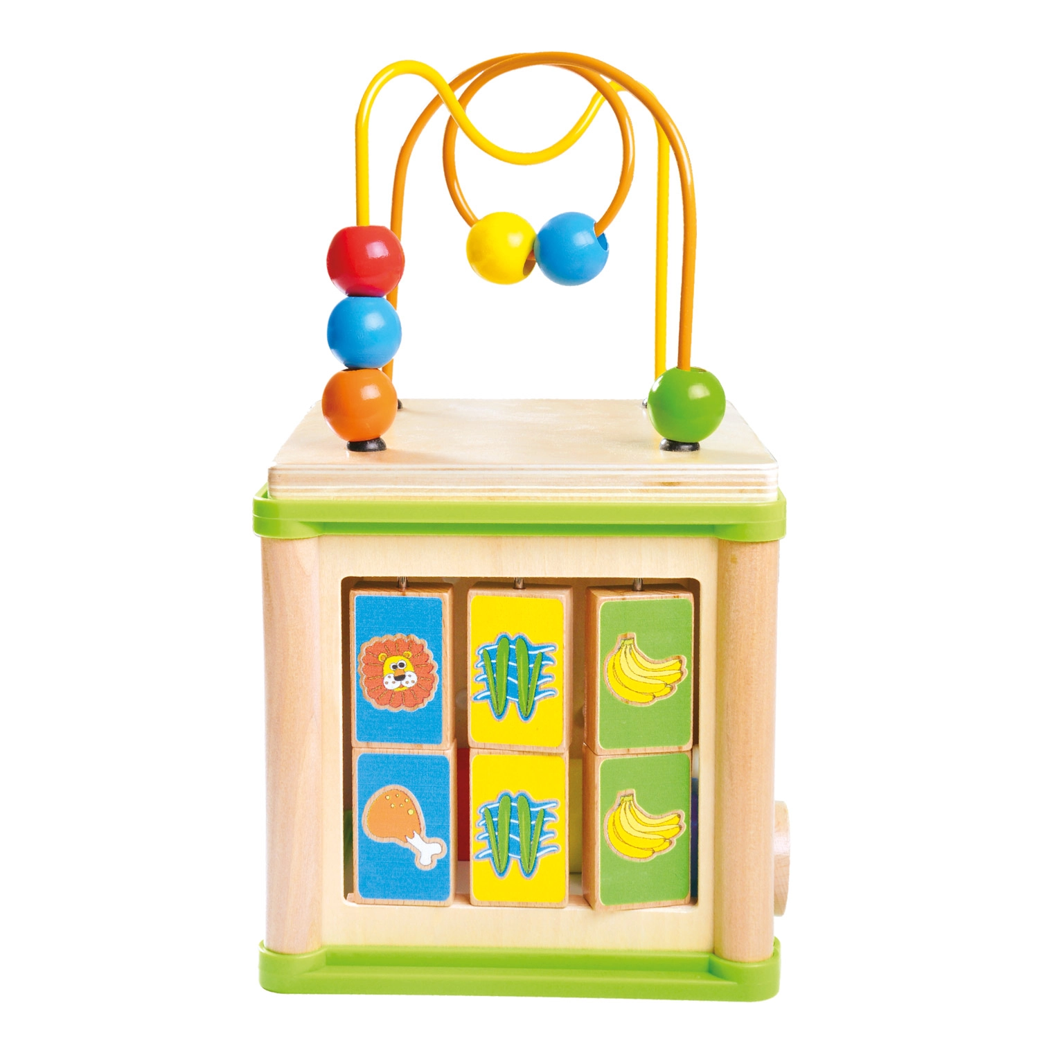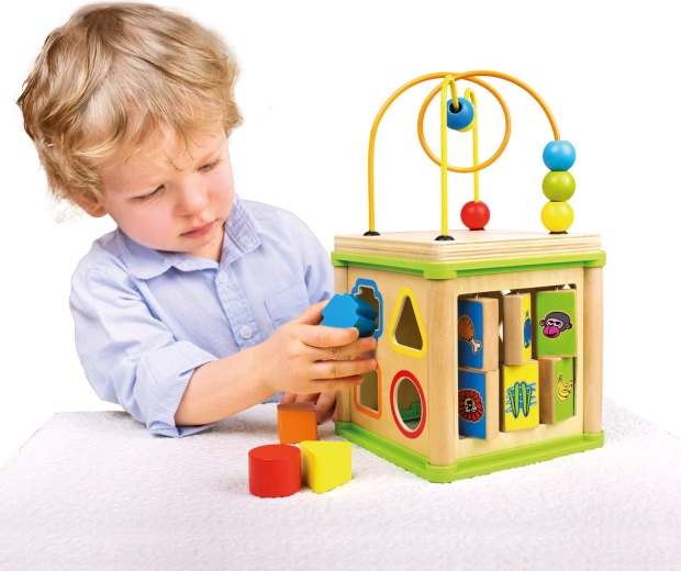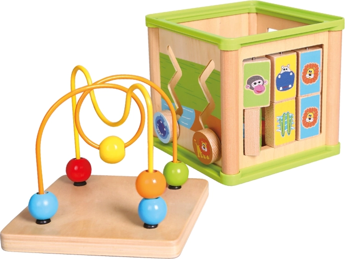 Ez a sokoldalú fa aktivitási kocka öt vonzó játékelemet egyesít kompakt kivitelben. A gyerekek párosíthatják az állatokat az eleségükkel, végigvezethetik a gyöngyöket a kanyargós pályákon, felfedezhetik a fogaskerekek működését, vagy gyakorolhatják a formabedobót. A felső rész egy gyöngylabirintus, amely támogatja a kéz–szem koordinációt és a koncentrációt.