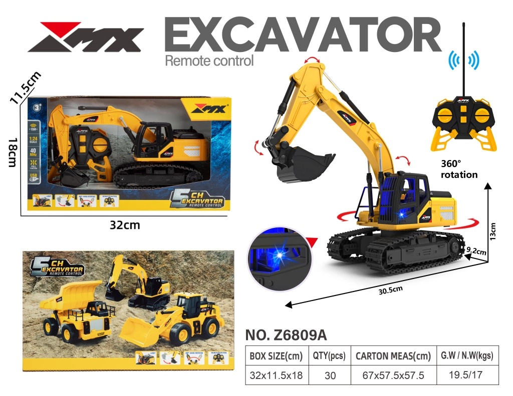 Realista RC kotrógép 1:24 méretarányban, 5 csatornás vezérléssel, 360°-ban forgatható felépítménnyel, kanál emeléssel és süllyesztéssel, valamint fényhatásokkal. A tölthető Li‑ion akkumulátornak és a 40 MHz-es, 10–15 m hatótávú távirányítónak köszönhetően sok szórakozást nyújt beltéren és kültéren egyaránt.