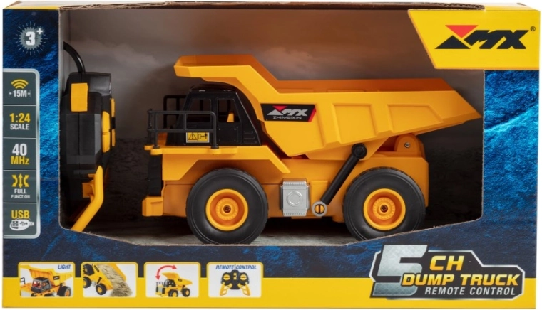 Realista RC billenőplatós autó 1:24 méretarányban, részletgazdag kidolgozással és teljesen funkcionális platóval. Irányítás 40 MHz frekvencián, hatótáv 10–15 m, 5 csatornás vezérlő, fényhatások és 3,7 V-os újratölthető akkumulátor gondoskodnak a szórakoztató és egyenletes haladásról 2–3 km/h sebességgel.