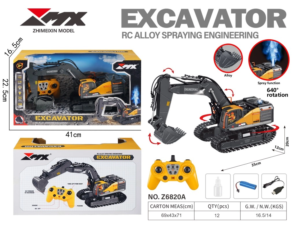 A 2,4 GHz-es frekvencián működő vezérlés akár 30 m hatótávot biztosít zavarás nélkül, így az irányítás folyamatos és pontos. A torony akár 640°-ban forgatható, ezért a valódi munkafolyamatok precízen szimulálhatók. A kotrógép fény- és hangeffekteket, valamint látványos gőz/permet effektust (spray) kínál, amely fokozza a vezetés és ásás élményét.