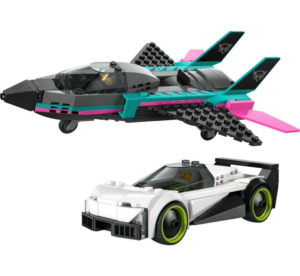 Ez a dinamikus szett a sebesség és kreativitás párosát hozza el: elegáns fehér versenyautó neon-zöld felnikkel és aerodinamikus sugárhajtású gép fekete–türkiz–rózsaszín színkombinációban. A nyitható pilótafülkék egyszerű beszállást biztosítanak a minifiguráknak, és megteremtik a izgalmas versenyek és légi show-k színterét.