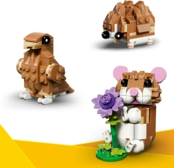Ez a kreatív építőkészlet fő modellként egy hörcsögöt tartalmaz mozgatható fejjel és elülső mancsokkal, amely bájos lila virágot tart. Alakítsd át aranyos sünivé apró virággal vagy fészeknél lévő madárrá tojással – egy készlet, három élmény.