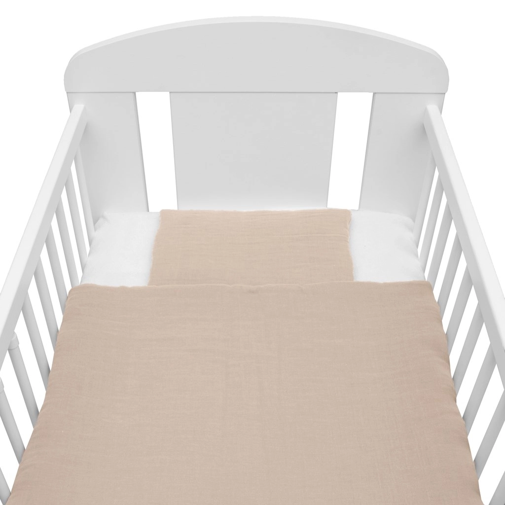 Ez a bézs musszlin szett kényelmet biztosít a babának az első naptól kezdve. A musszlin könnyű, levegős szerkezete kiváló légáramlást nyújt, és csökkenti a túlmelegedés kockázatát. A antiallergén szálakból készült töltet biztonságos, érzékeny babáknak is megfelelő.